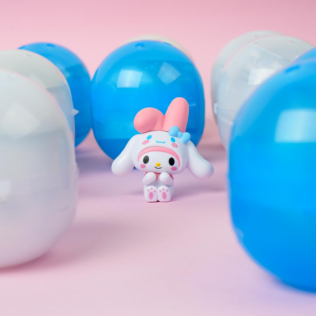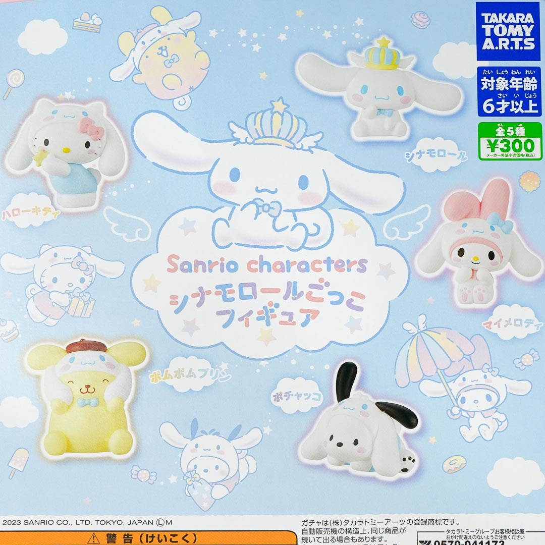 The Sanrio cuties are playing dress up! This kawaii figure features a Sanrio character wearing a Cinnamoroll costume. It's perfect for fans of our favorite flying pup!