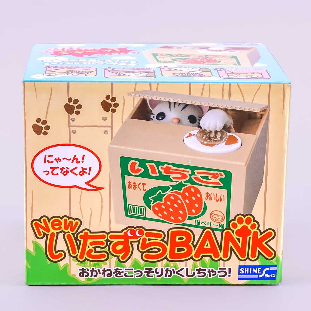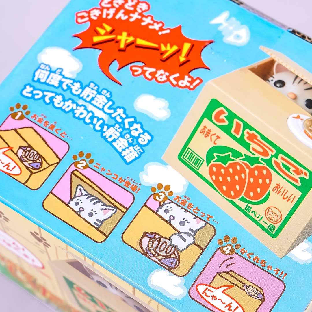 Have fun saving money with this super cute strawberry box piggy bank toy. Place a coin on top of the plate and a naughty little kitty will come out to take it away from you! Music plays whenever the cat appears!