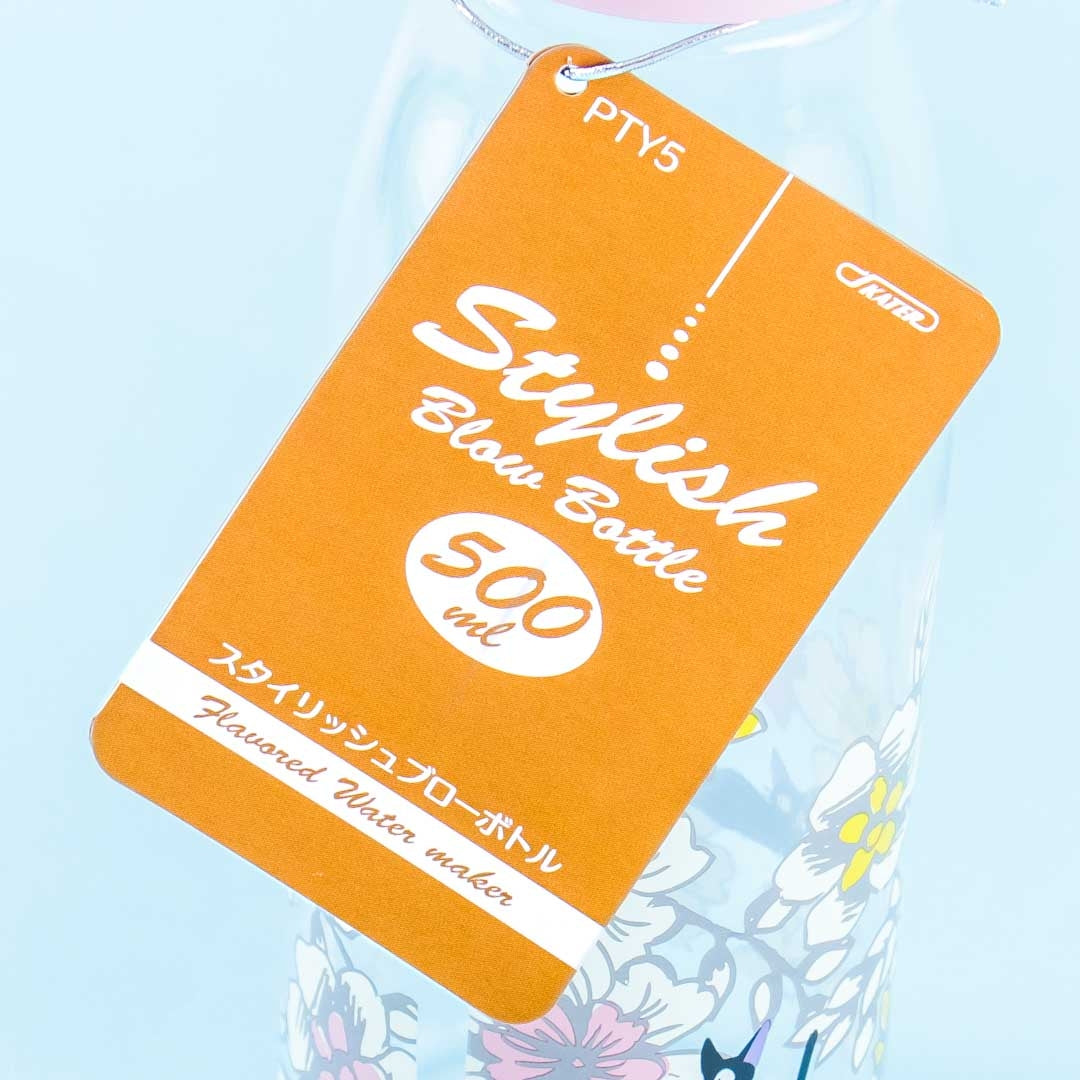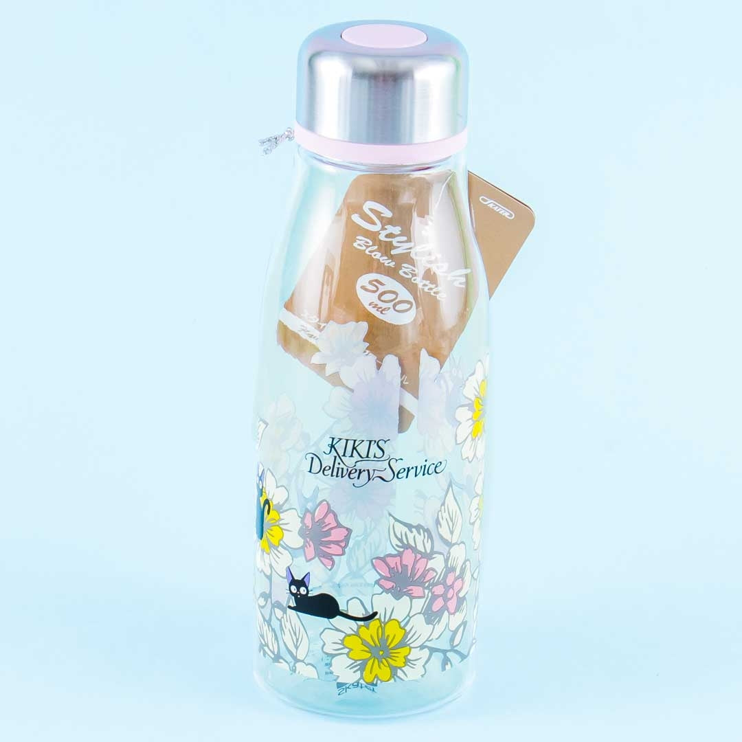• A transparent floral water bottle featuring Jiji from Kiki’s Delivery Service