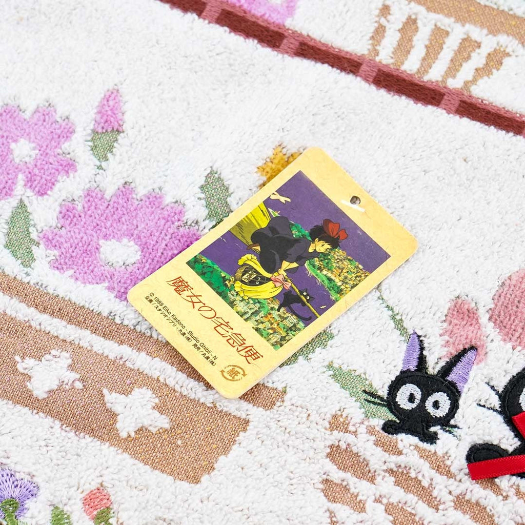 A kawaii cotton towel featuring embroidery of Jiji from Kiki's Delivery Service playing among flowers