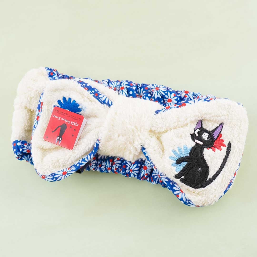A cute floral headband with a fluffy bow that has an illustration of Jiji from Kiki’s Delivery Service