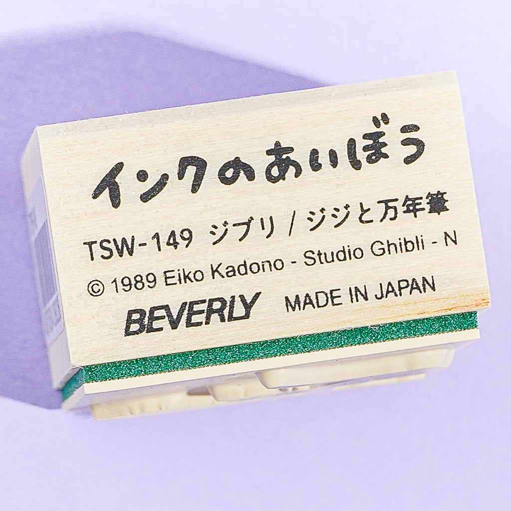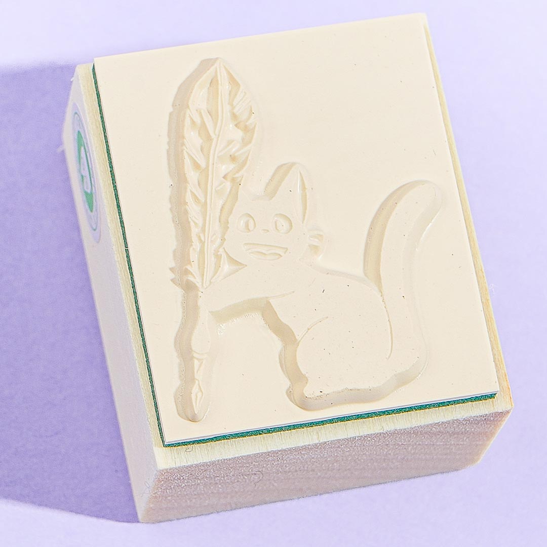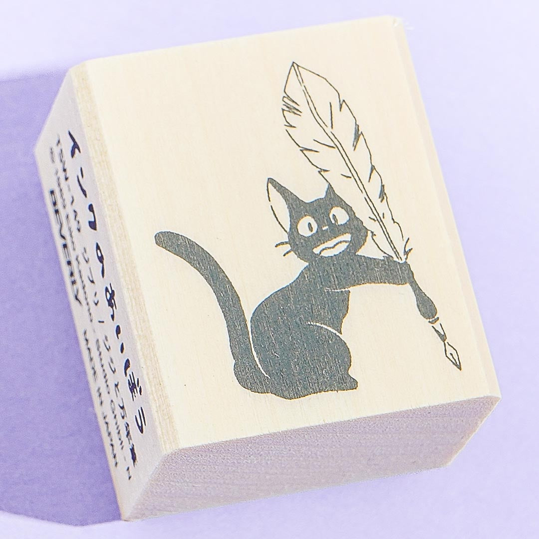 Add this super kawaii stamp to your stationery collection. It showcases Jiji the cat from Kiki's Delivery Service! He's trying to write with a feather pen. You can use ink pads, pens, and colored pencils for the stamp.