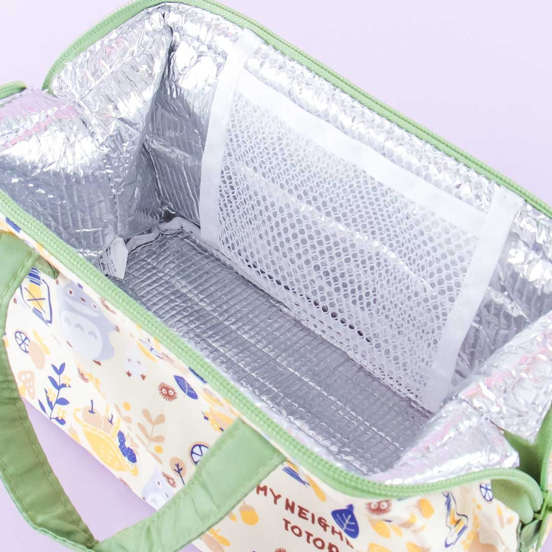 • A cute insulated lunch bag covered in prints of characters from My Neighbor Totoro in a garden in autumn