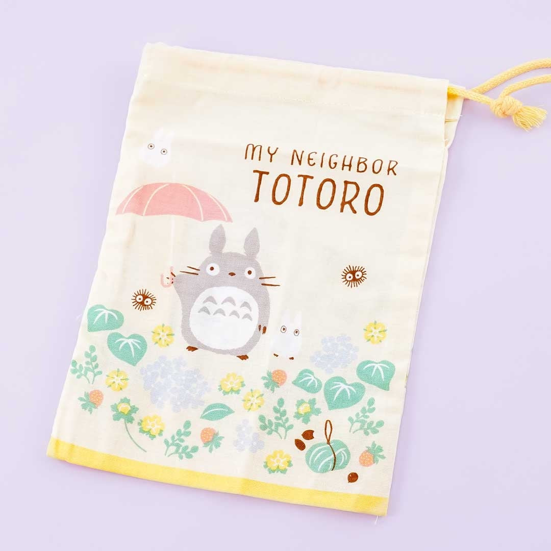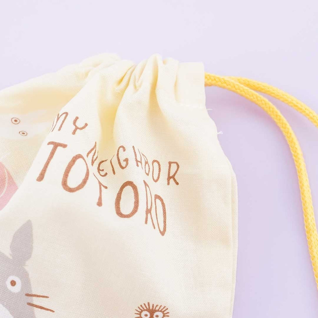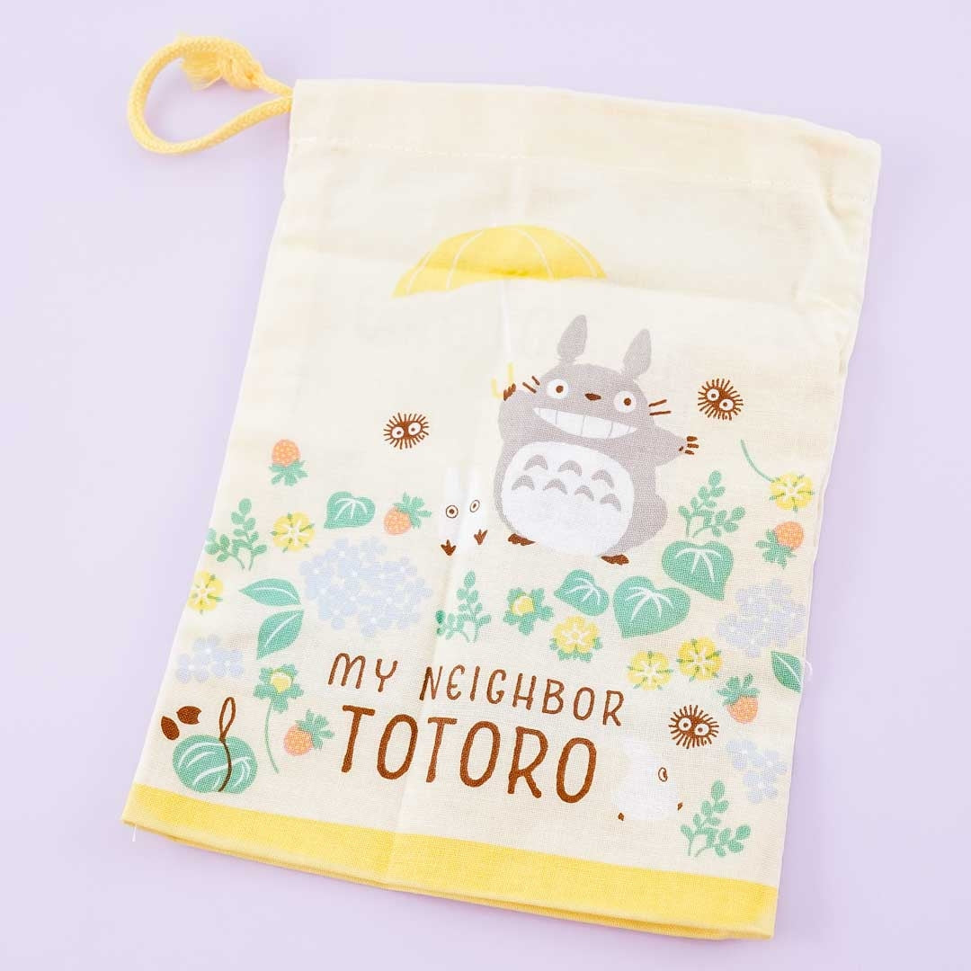 A super cute drawstring dental care bag featuring Totoro and friends playing in the forest