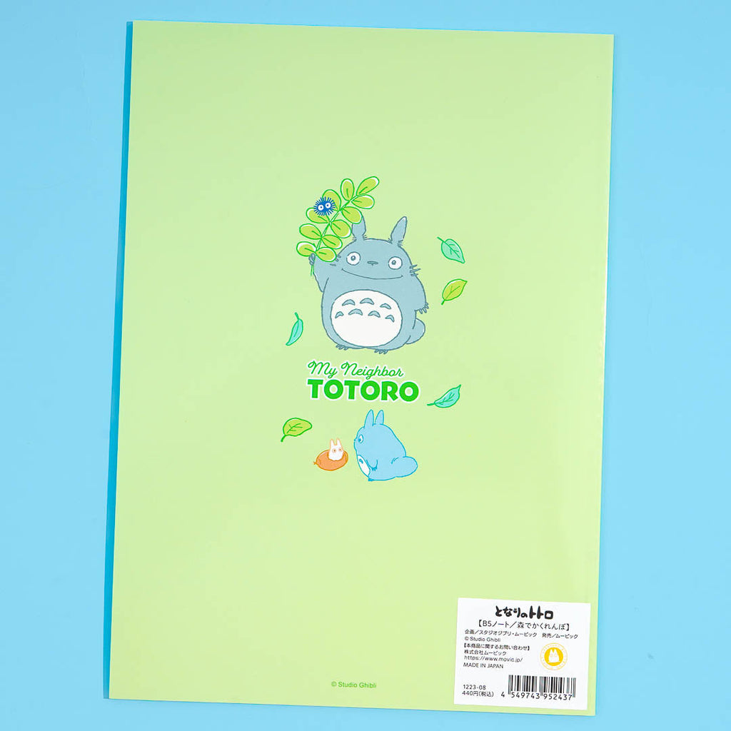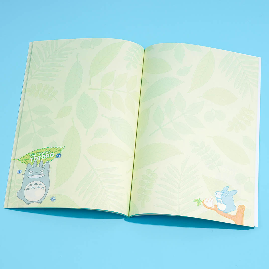 Have fun writing your notes in this super kawaii B5-sized notebook! The cover is decorated with an illustration of Totoro playing hide-and-seek in the forest with its friends. Each page has no lines but is filled with faded prints of leaves!