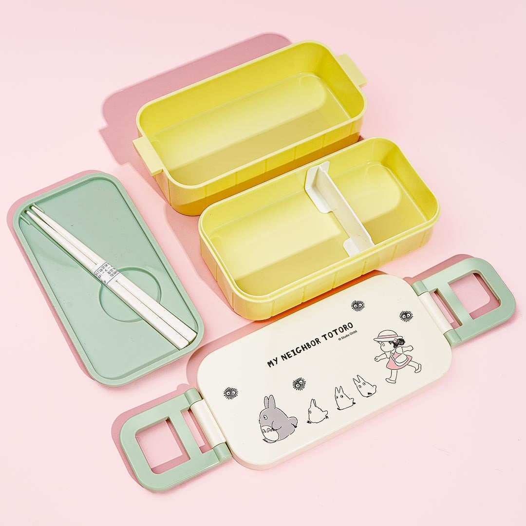This super kawaii two-layered lunch box is decorated with prints of My Neighbor Totoro characters marching single-file. It has a removable divider, a middle layer with chopsticks, and a lid with two clasps. Remember to remove the lid and middle layer when heating meals in the microwave!