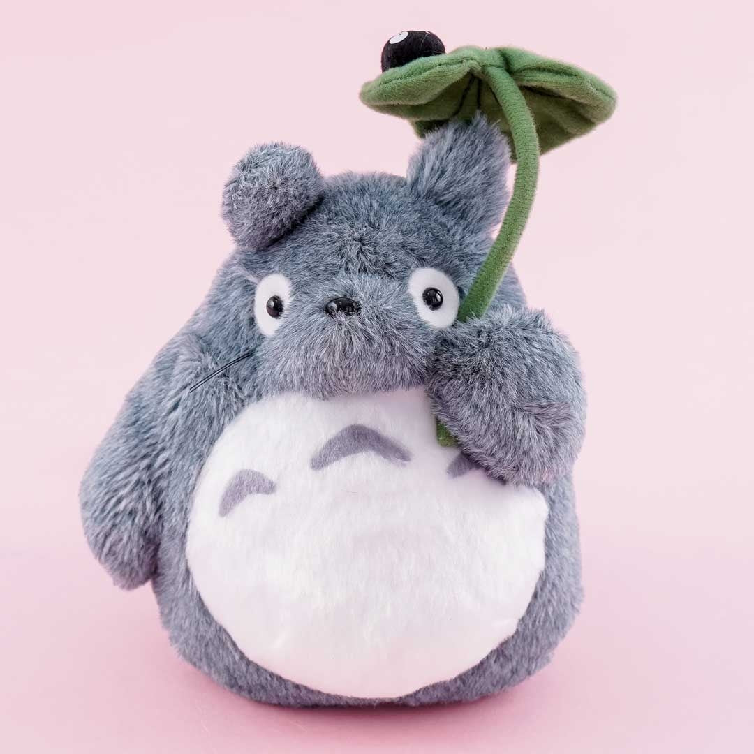 This kawaii medium-sized Totoro plushie is carrying a leaf with a soot sprite on top! It can be used in otedama, a traditional Japanese game where small bean bags are tossed around.