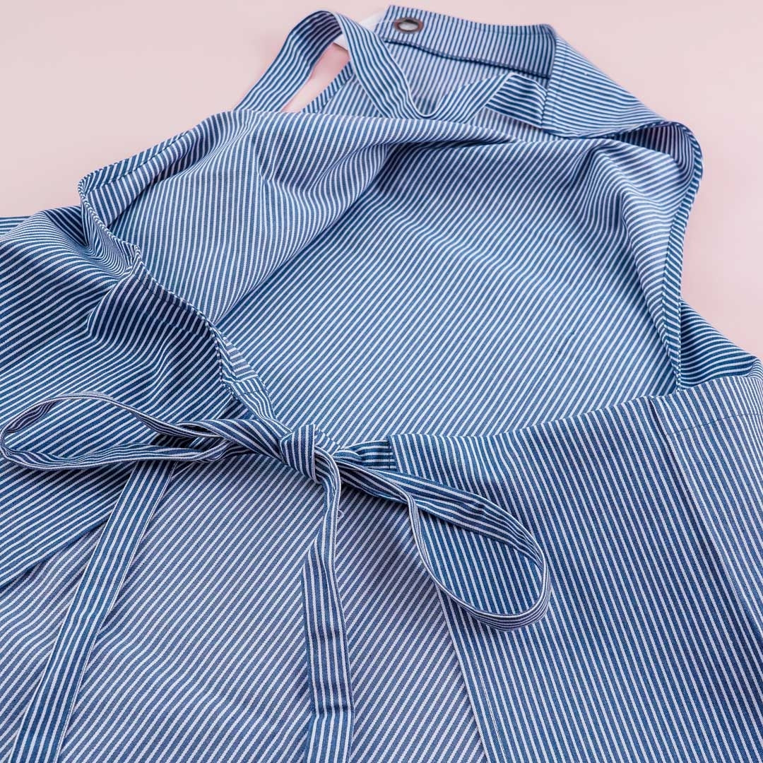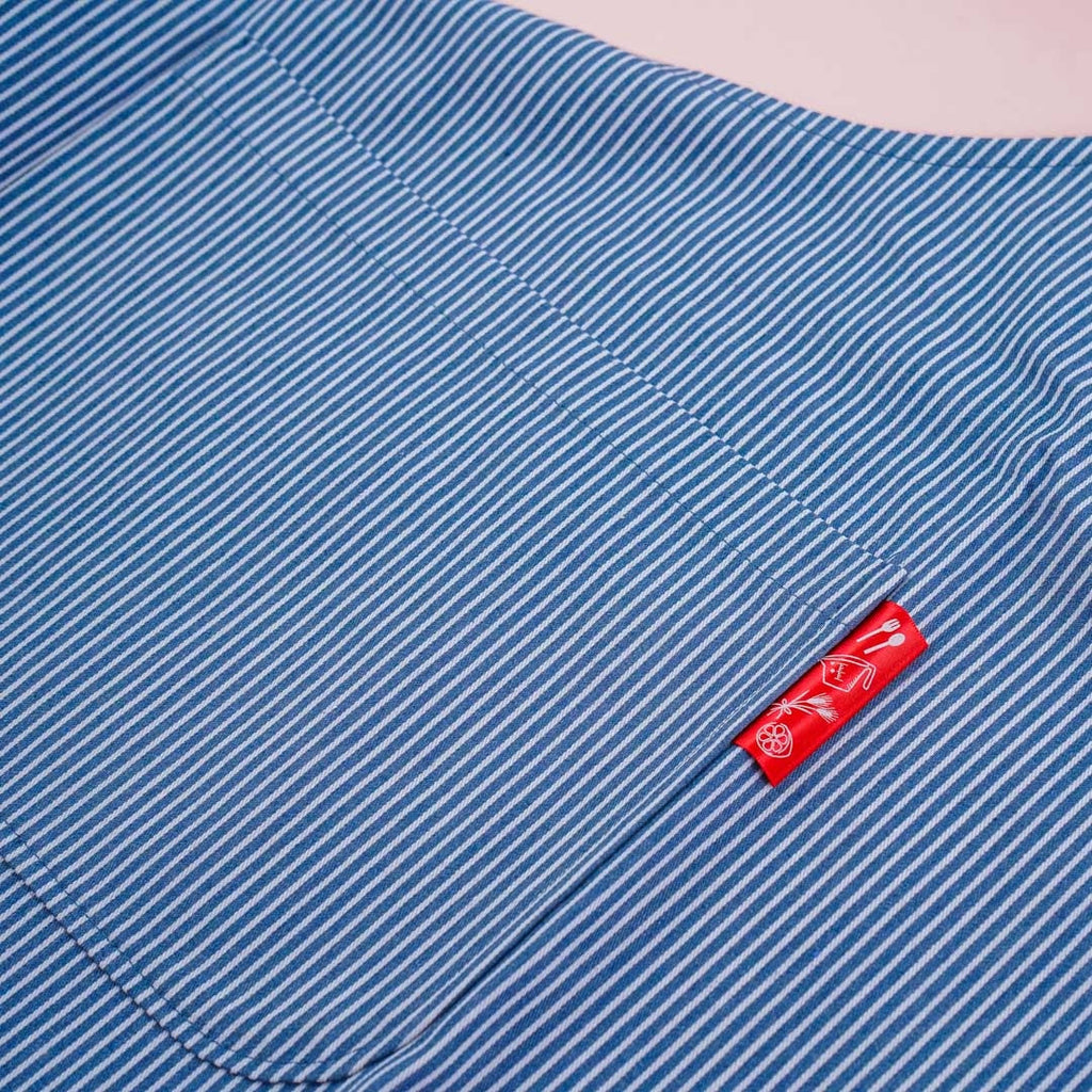 A kawaii striped apron featuring the Hapidanbui gang all dressed as chefs