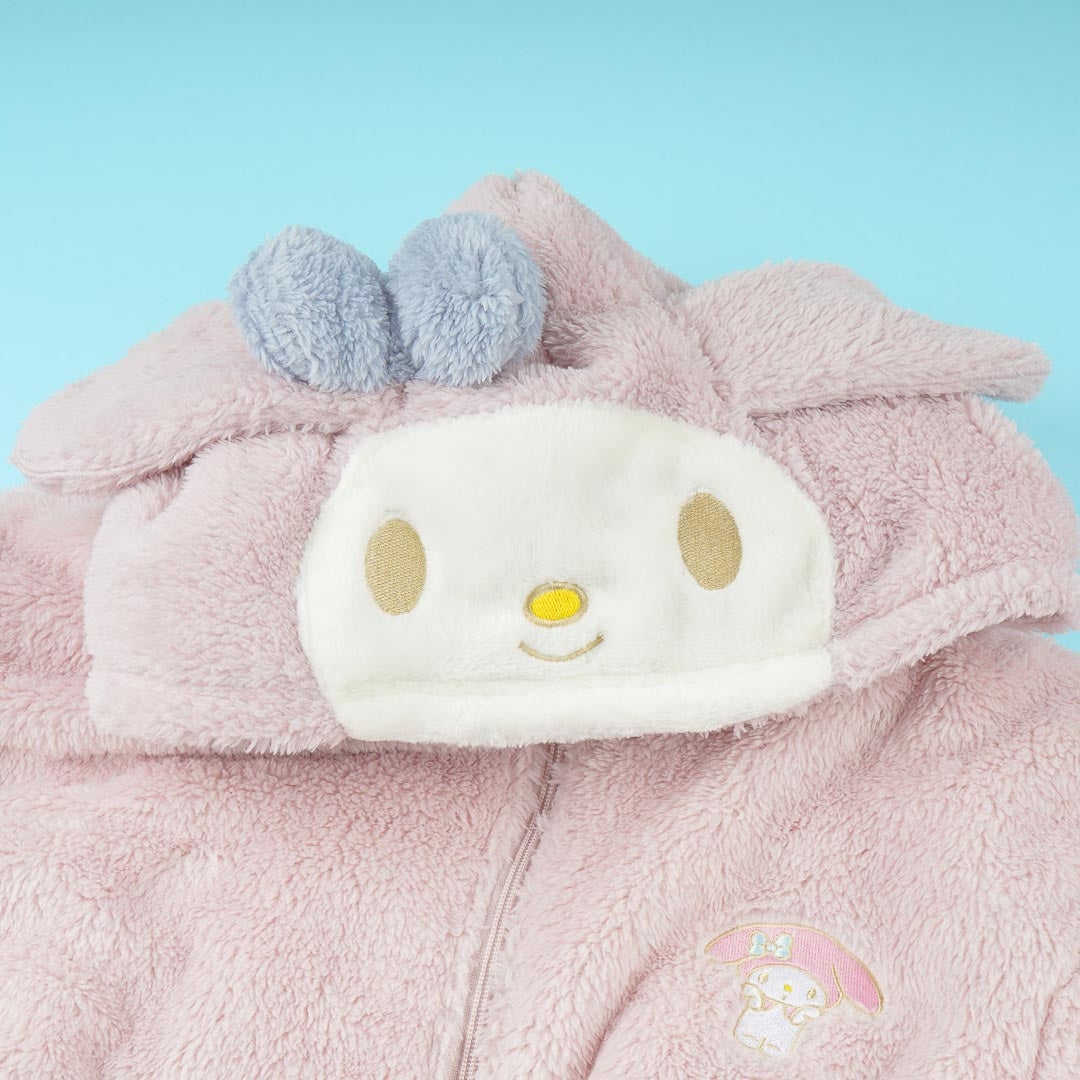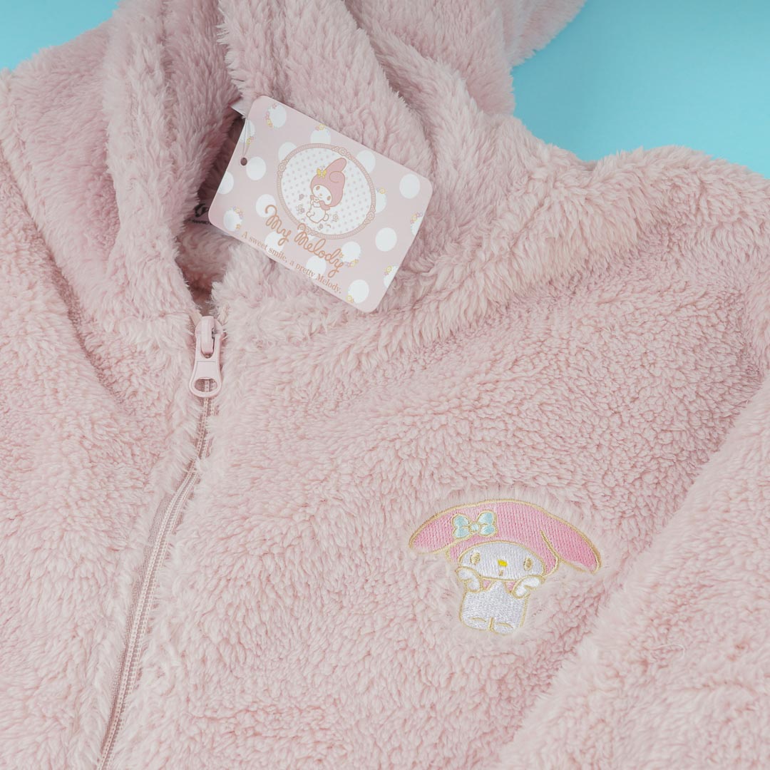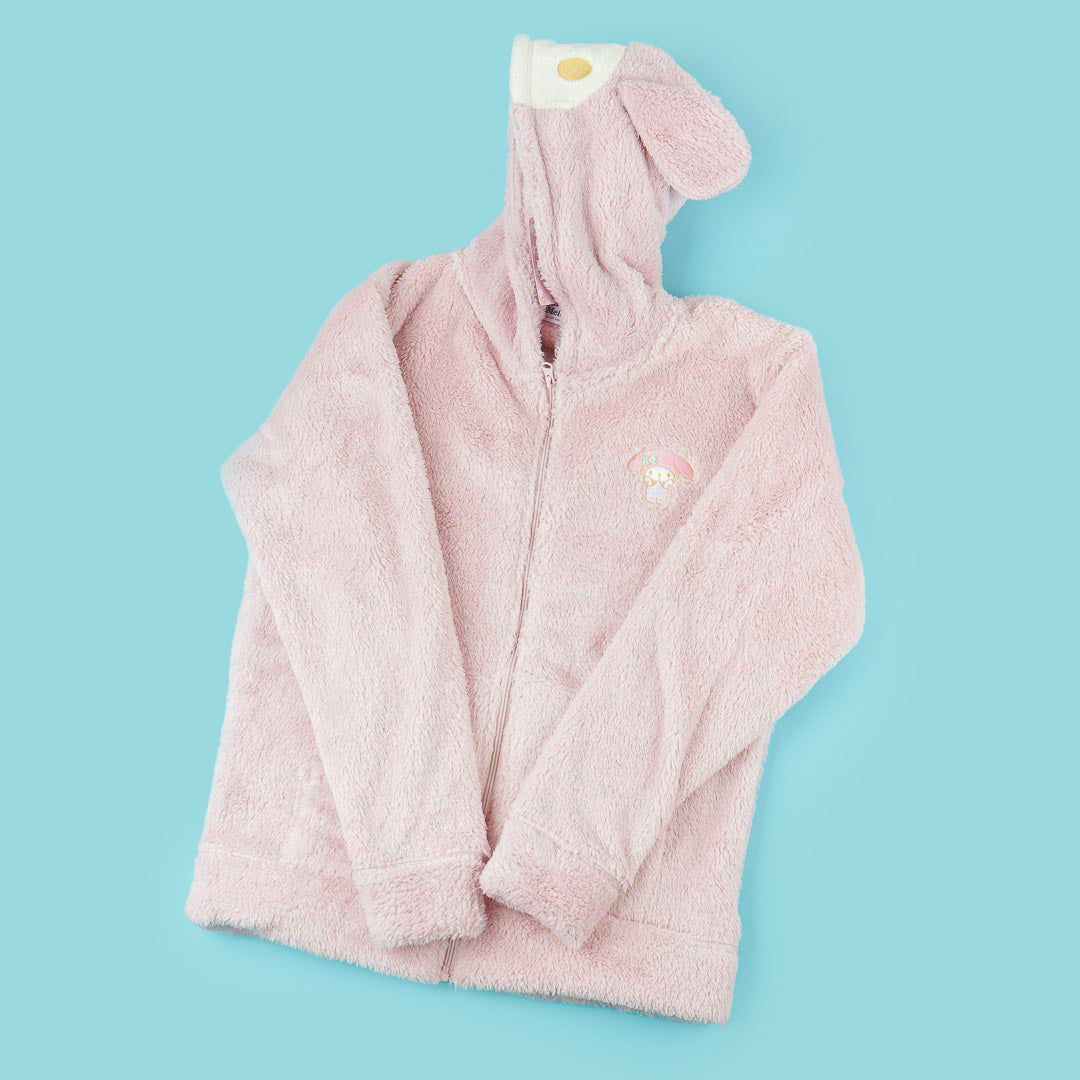 Be as cute as my My Melody by wearing this kawaii hoodie! It's made from super-soft fleece material and features a special My Melody design with pop-out ears attached to the hood. The hoodie also has an embroidered patch on the front.