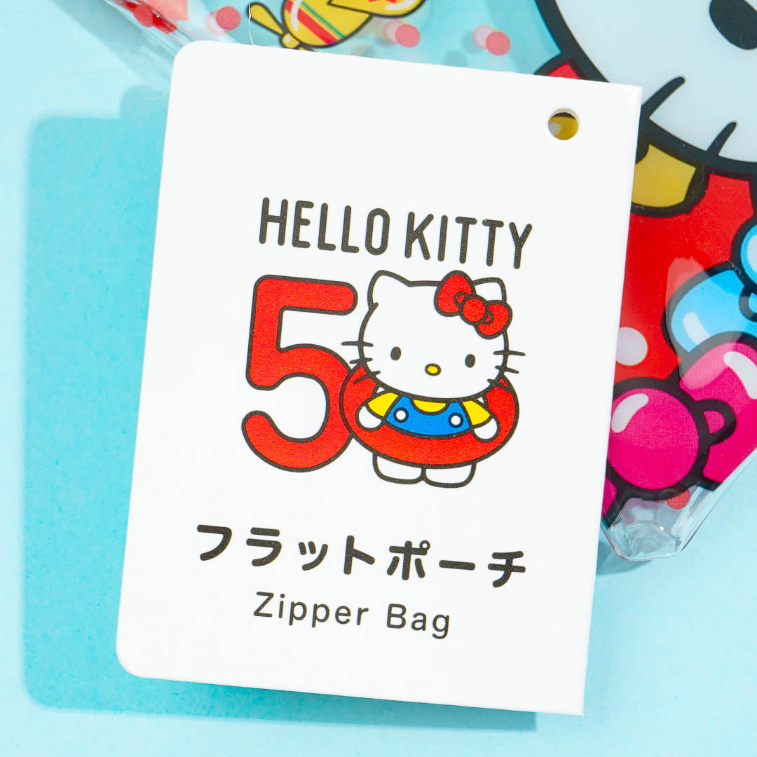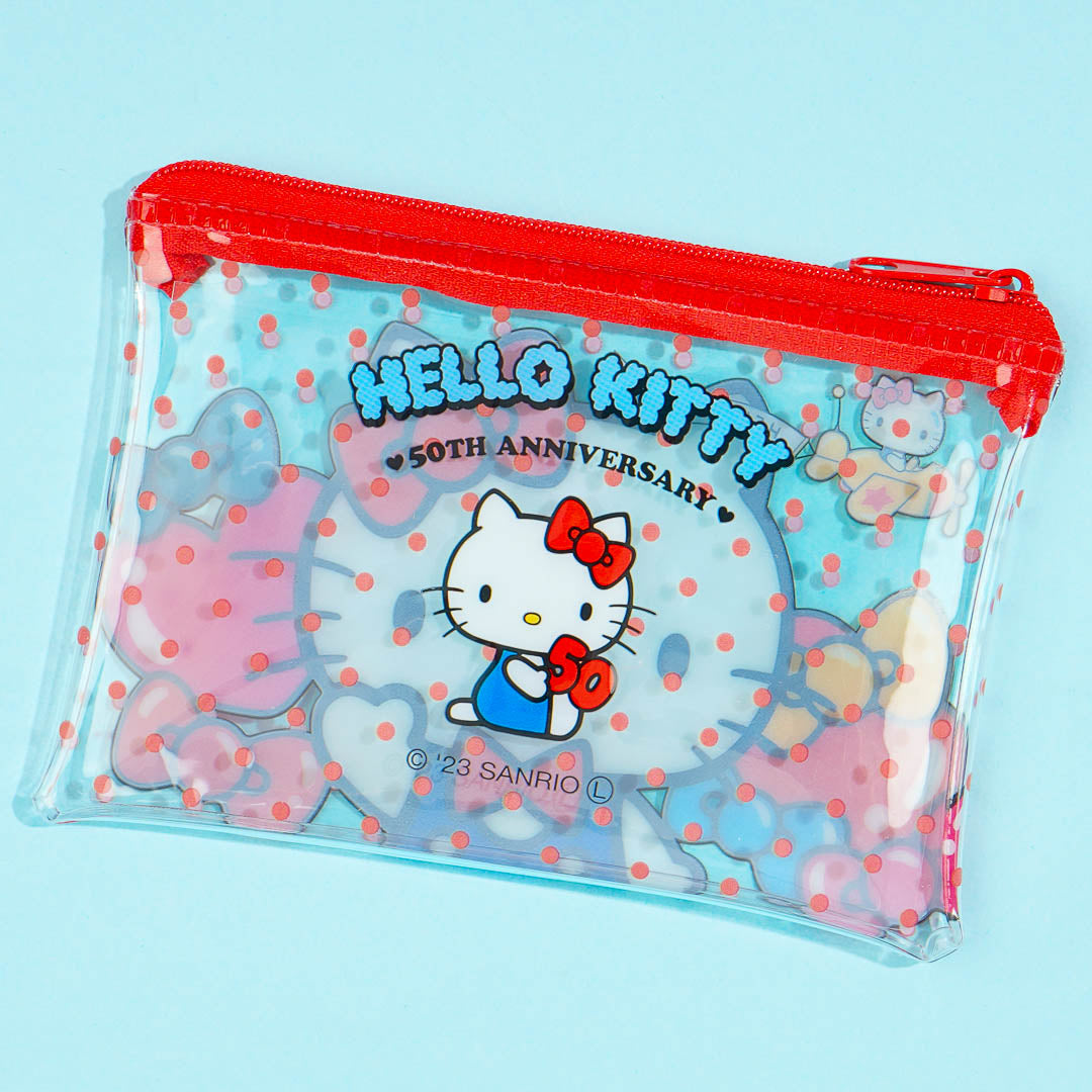 This kawaii transparent pouch has a super cute illustration of Hello Kitty partying with lots of bows and hearts! Use this convenient flat pouch to store your bus pass and other small essentials. It’s specifically designed for the 50th-anniversary celebration of Hello Kitty!