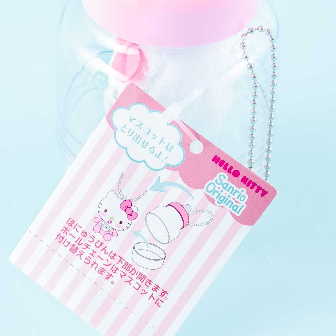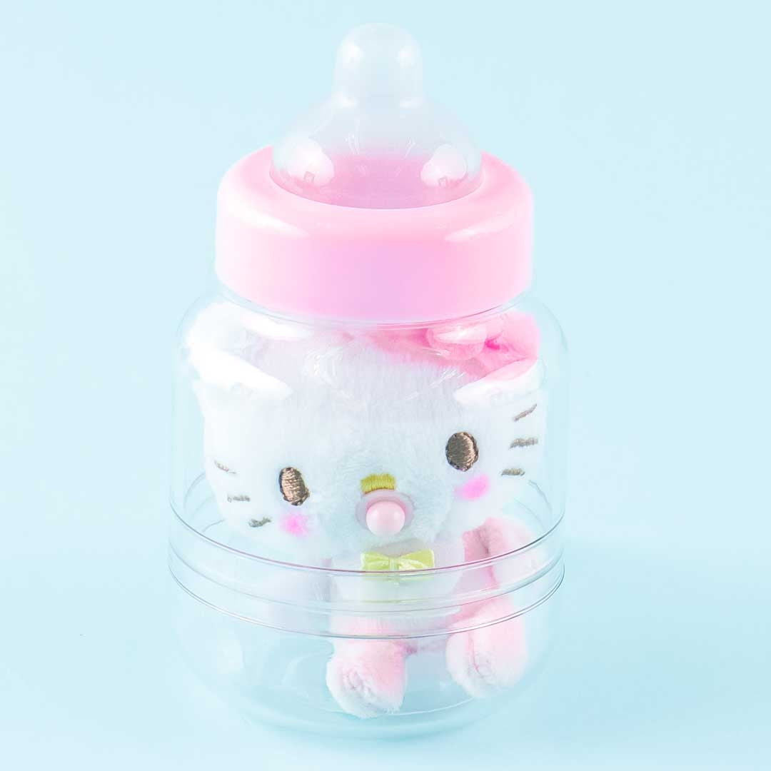 A super cute medium-sized Hello Kitty baby plushie inside a baby bottle charm