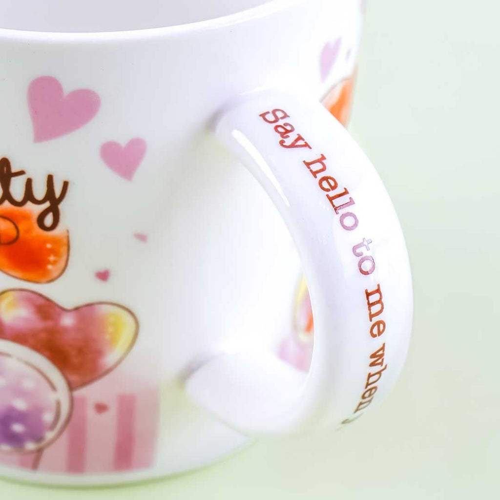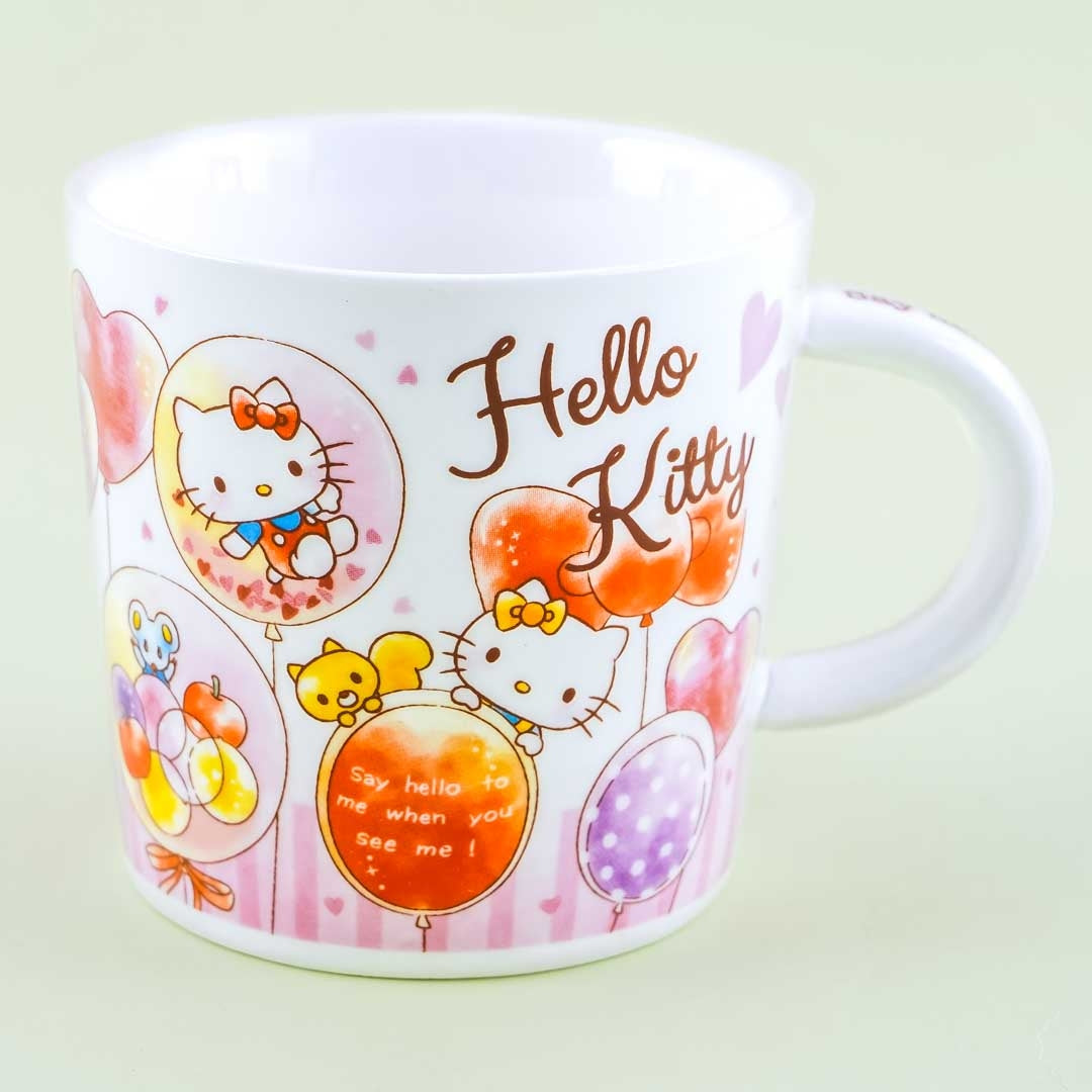 A cute mug with illustrations of Hello Kitty, Dear Daniel, and lots of balloons