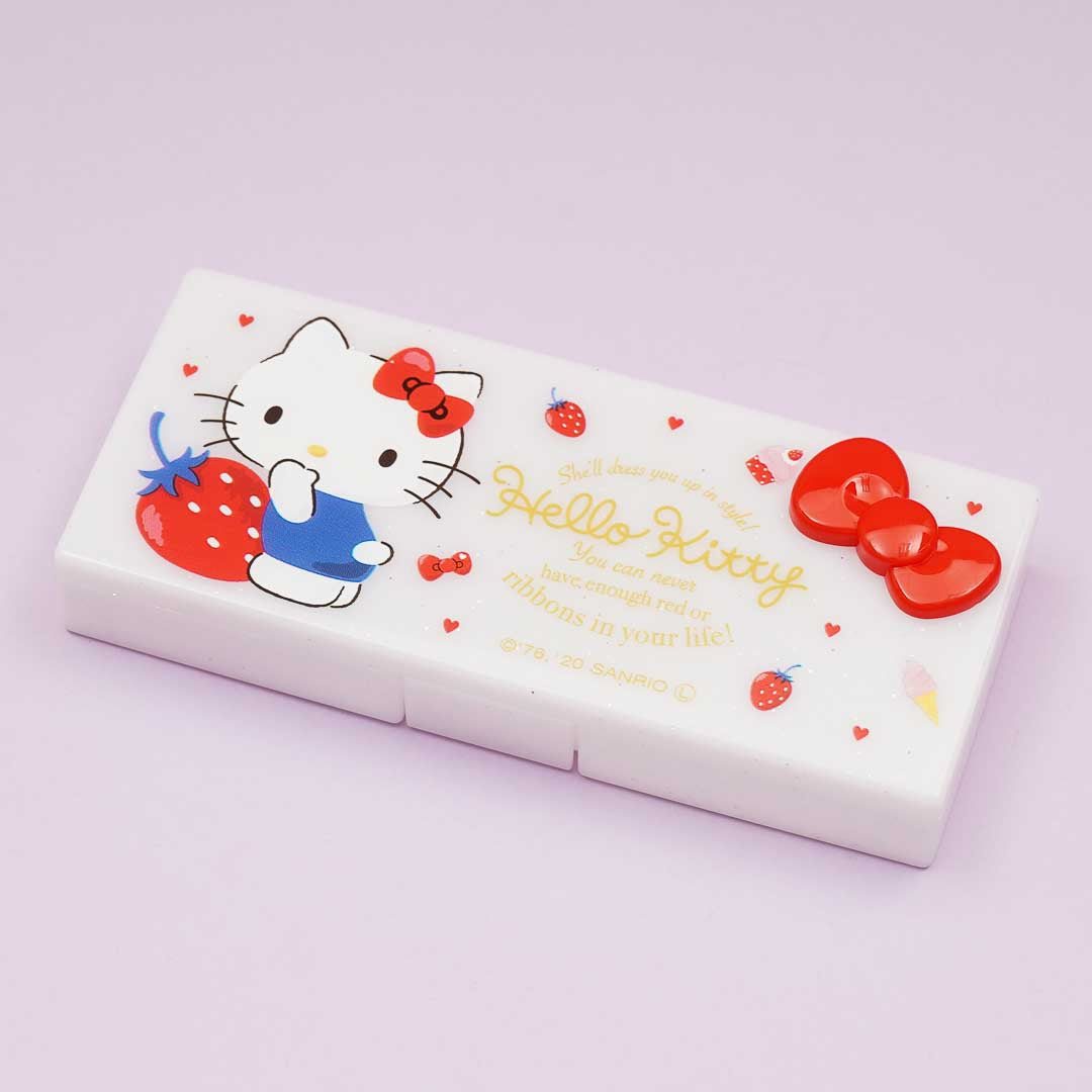 Keep your favorite earrings inside this kawaii rectangular case! It’s decorated with super cute prints of Hello Kitty, strawberries, bows, and tiny hearts.