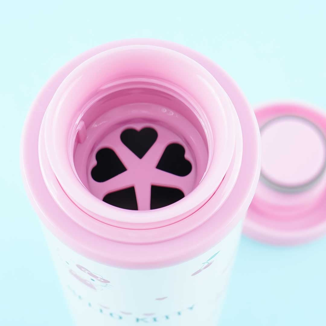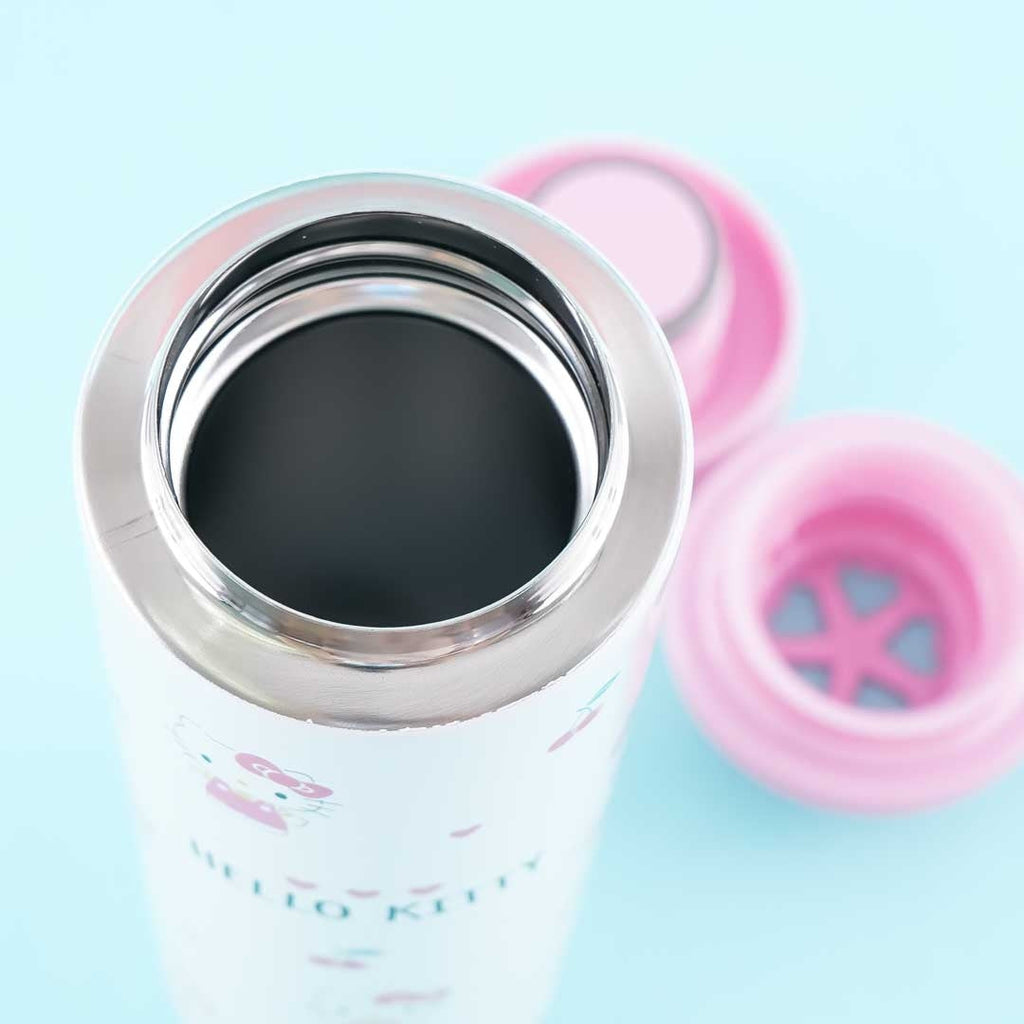 This cute stainless steel bottle is illustrated with Hello Kitty, cherries, and hearts! It's lightweight and easy to carry around so you can bring your favorite drink wherever you go. Fasten the twist lid to cover the bottle! You can also use its heart-shaped filter for ice or for tea packets.