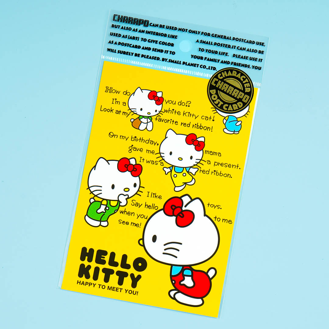 Use this kawaii postcard to keep in touch with your buddies! It showcases a cute illustration of Hello Kitty who is happy to meet a new friend.