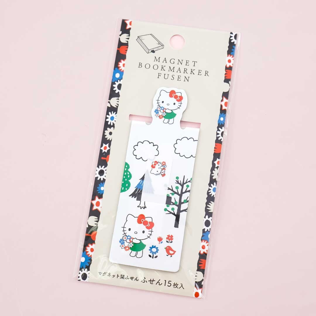 • A kawaii magnet bookmark and sticky tabs set featuring Hello Kitty collecting flowers in the forest