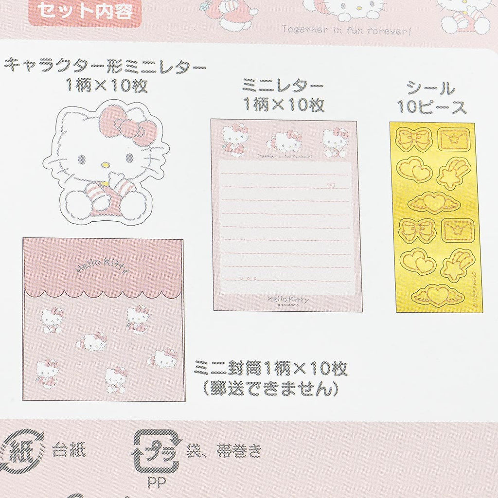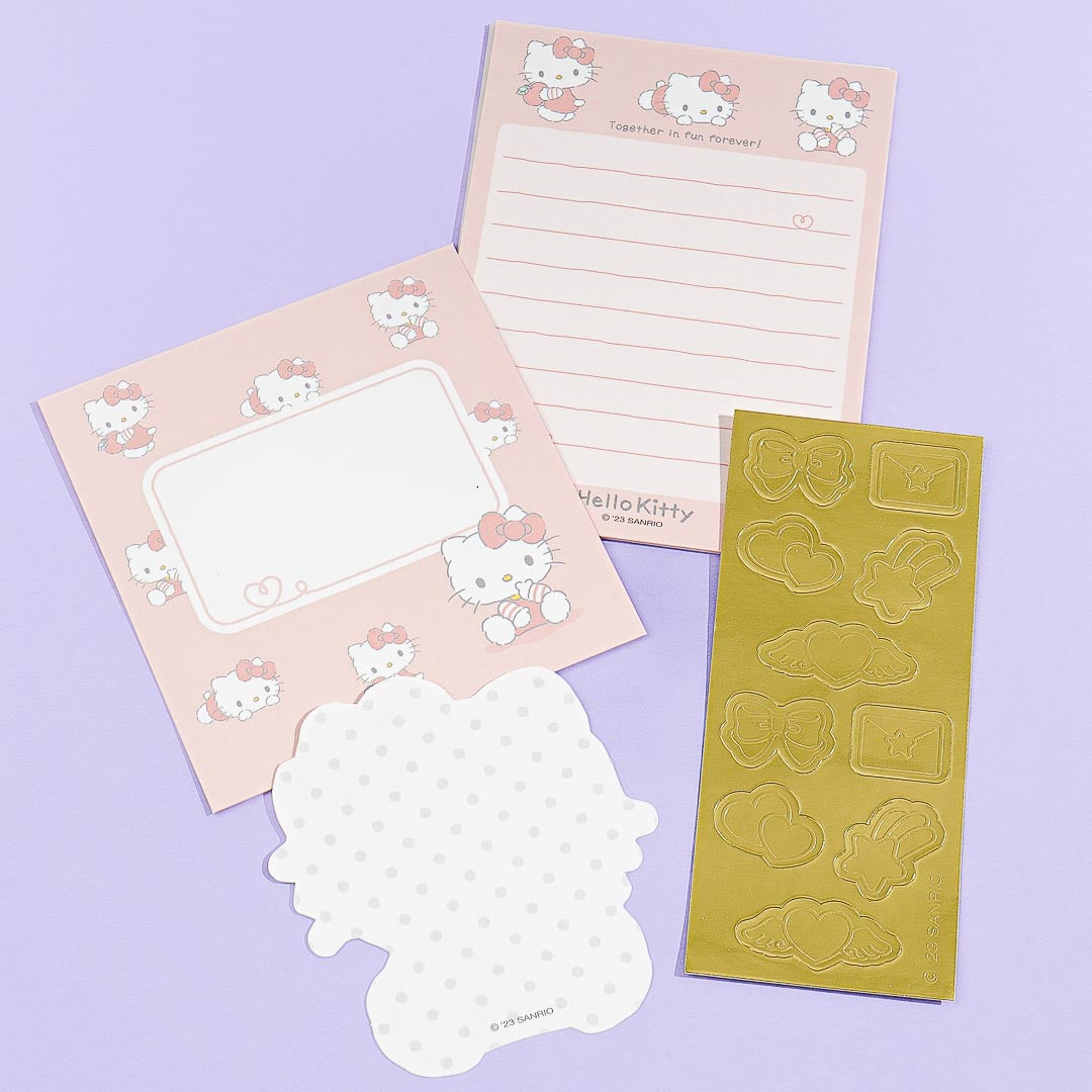 Includes: 10 x Hello Kitty die-cut sheets, 10 x square sheets, 10 x mini envelopes, and 1 x gold sticker sheet