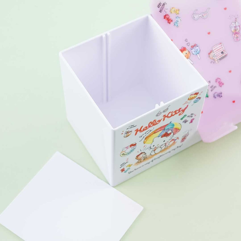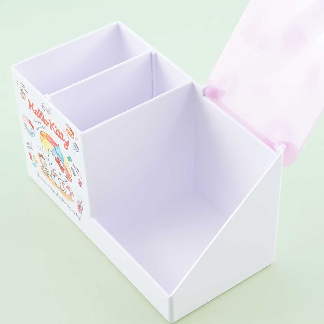 Always keep your desk organized by using this kawaii storage to place your writing tools in! It’s made of sturdy plastic and has a cute illustration of Hello Kitty and Tiny Chum enjoying summertime sweets such as ice popsicles and shakes! The stand area has a removable partition and the built-in phone stand can be flipped and works as a lid for an extra hidden compartment.