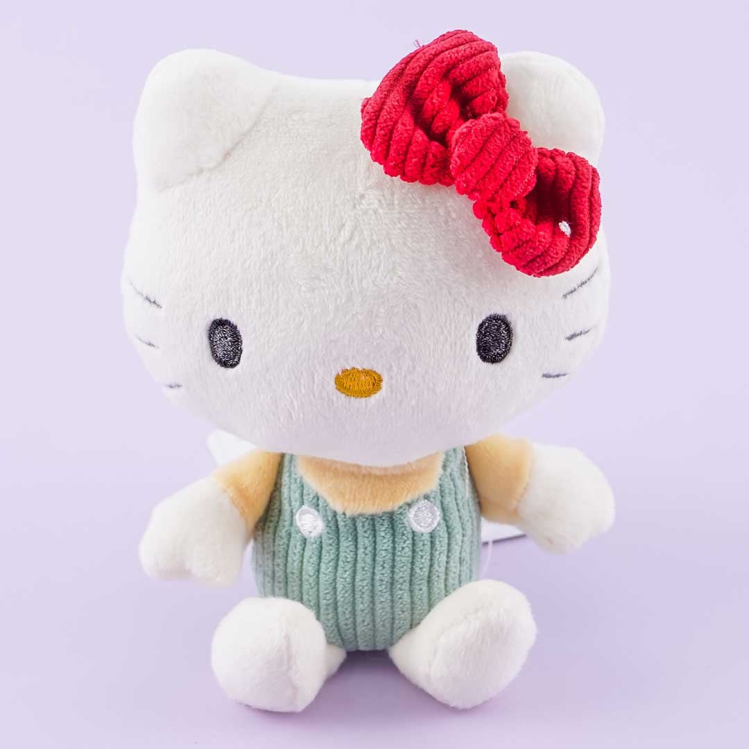 A super cute medium-sized retro Hello Kitty bean plushie wearing corduroy overalls