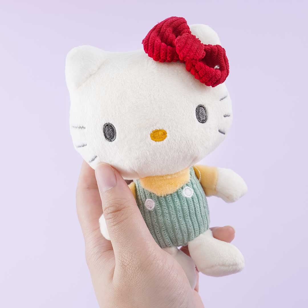 Have fun pretending that you're back in the 70s when you play with this kawaii Hello Kitty bean plushie! This retro medium-sized stuffed toy is wearing corduroy overalls. It's the perfect addition to your plushie collection!