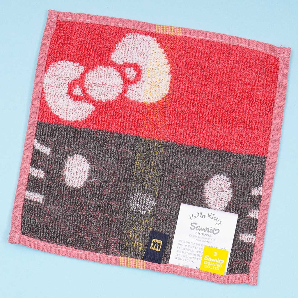 • A kawaii hand towel showcasing a print of Hello Kitty's face with regular colors on one side and reversed colors on the back