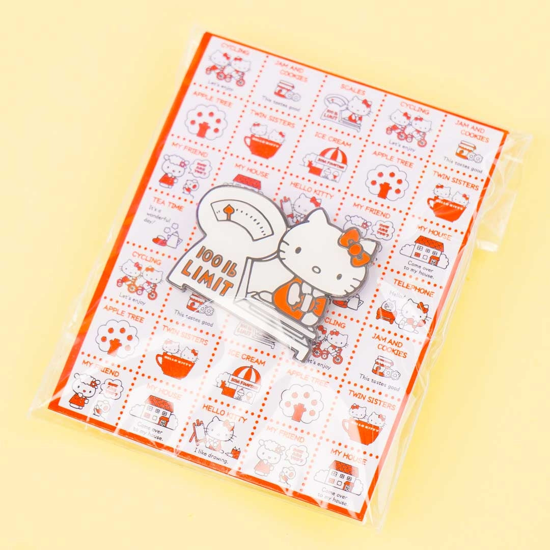 • A super cute pin showcasing Hello Kitty on a weighing scale