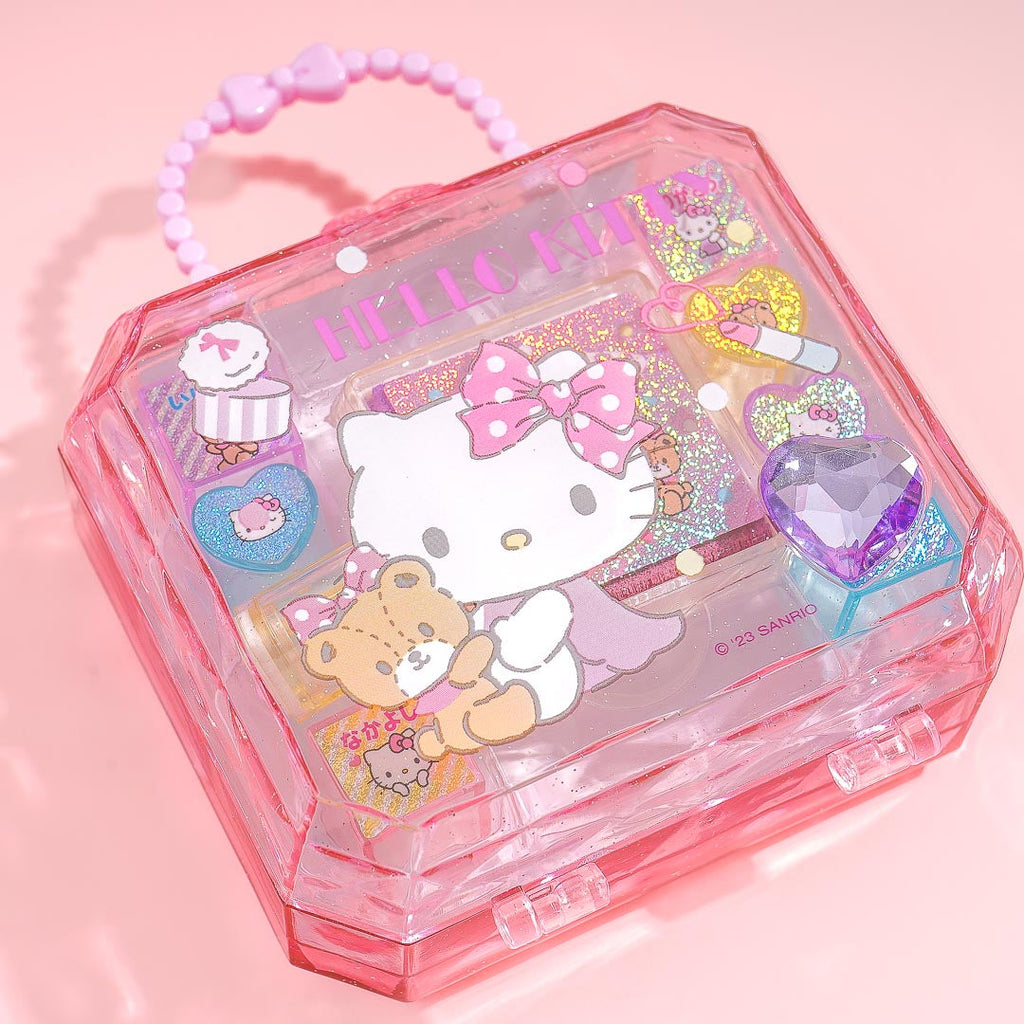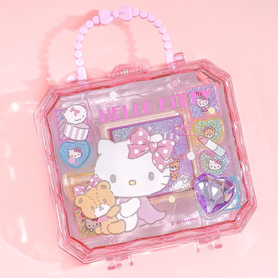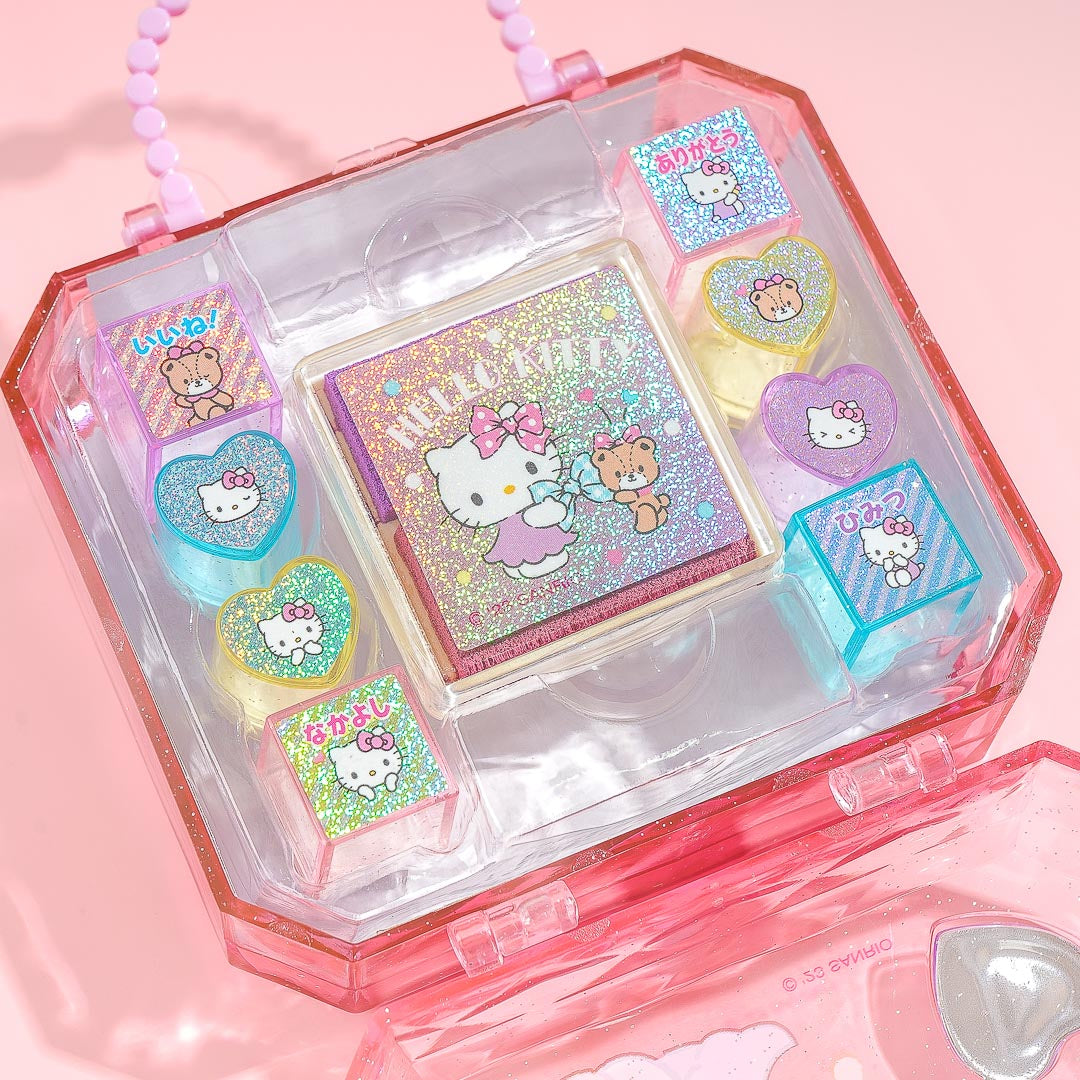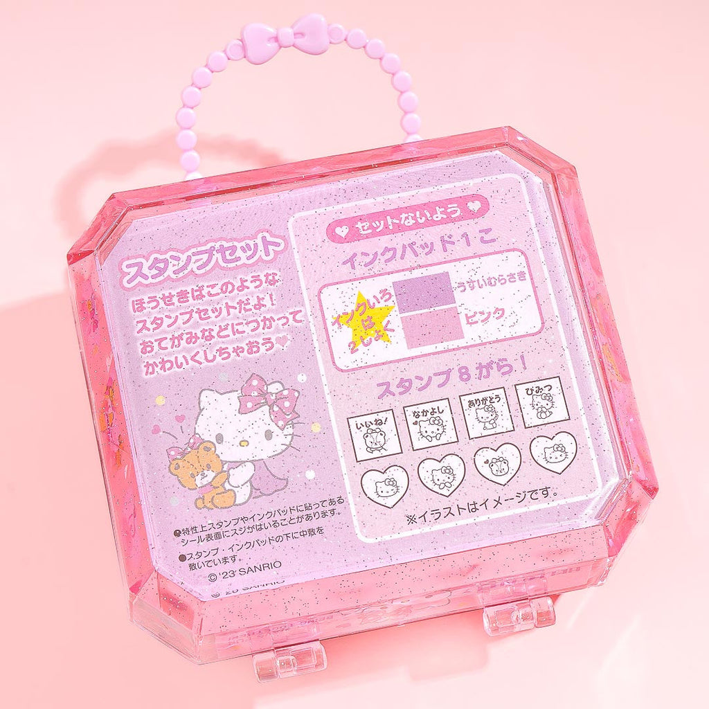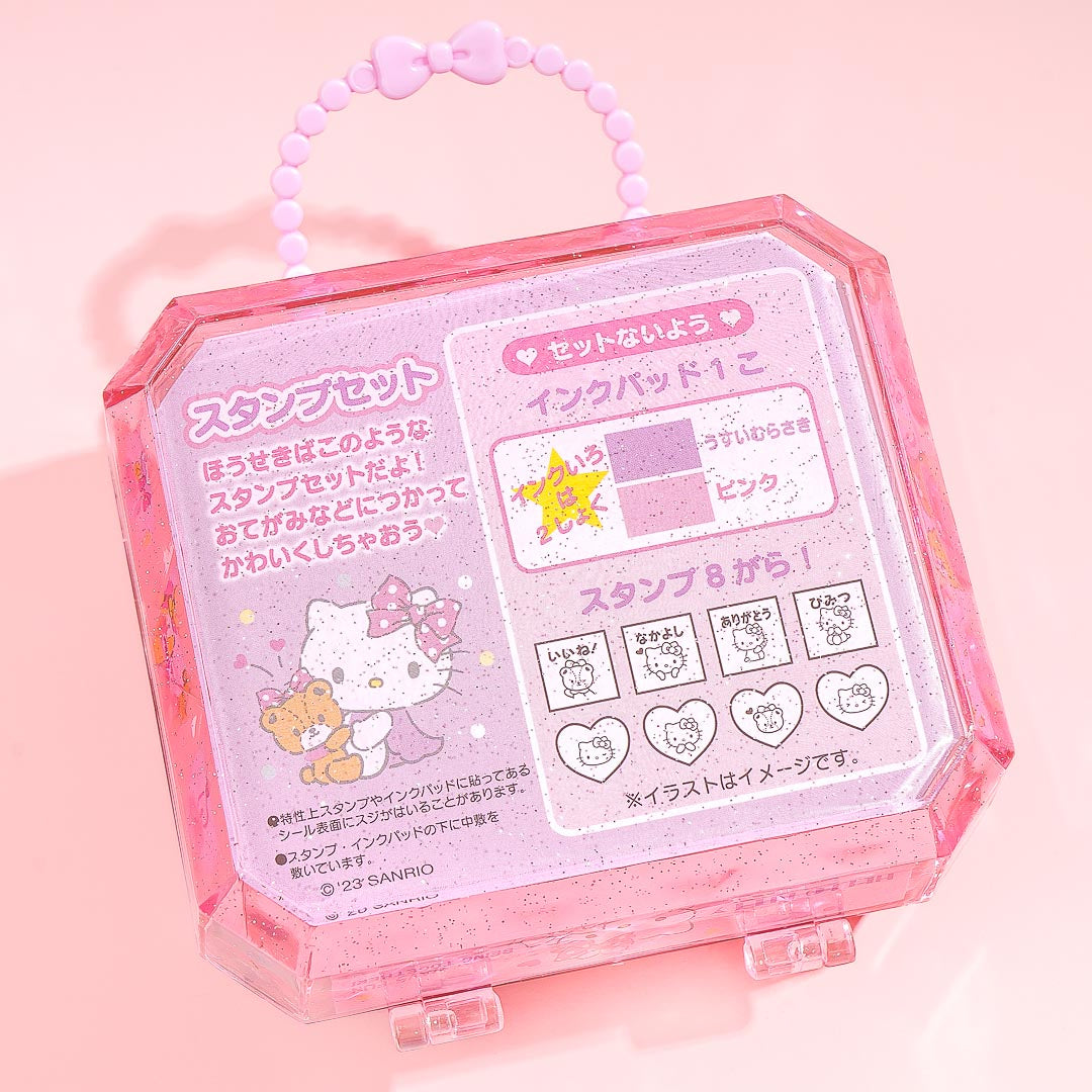 Use this kawaii stamp set to decorate your art projects! It features glittery rubber stamps with prints of Hello Kitty. The set comes with a sparkly case that looks like a fancy jewelry box.