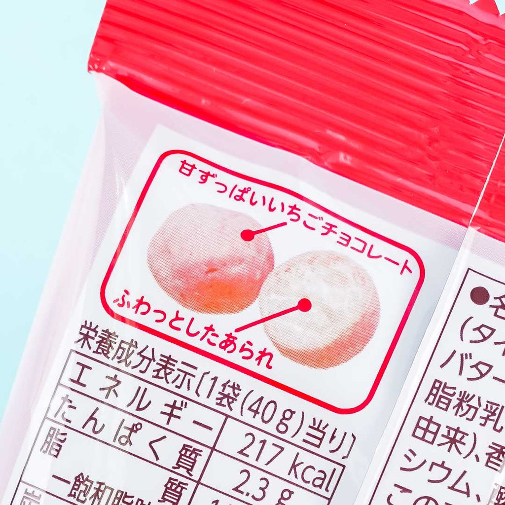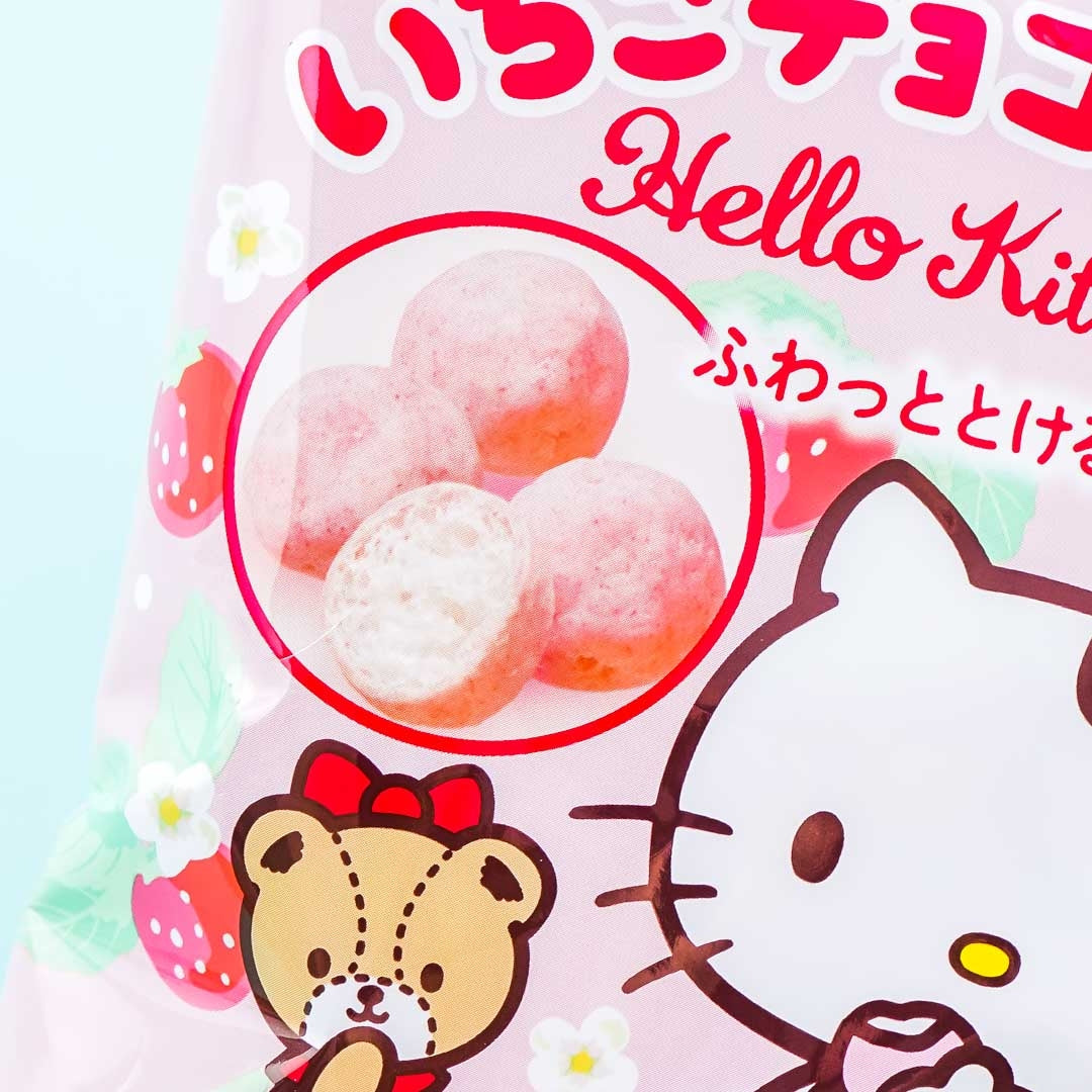 • A pack of strawberry chocolate-covered arare rice crackers illustrated with Hello Kitty