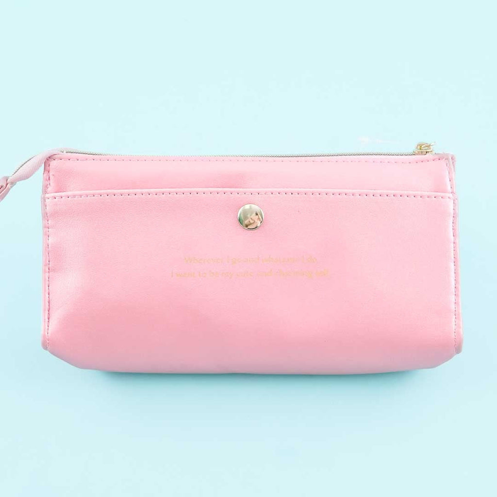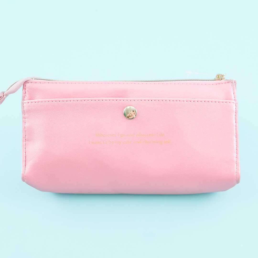 Use this super kawaii pen case to store your pencils, markers, and other writing tools. It features a print of Hello Kitty standing! This zippered case has an inner pocket, an outer pocket with a button closure, and a lovely heart-shaped charm.