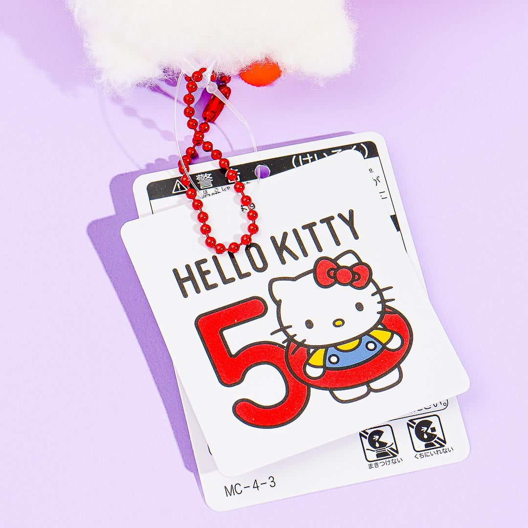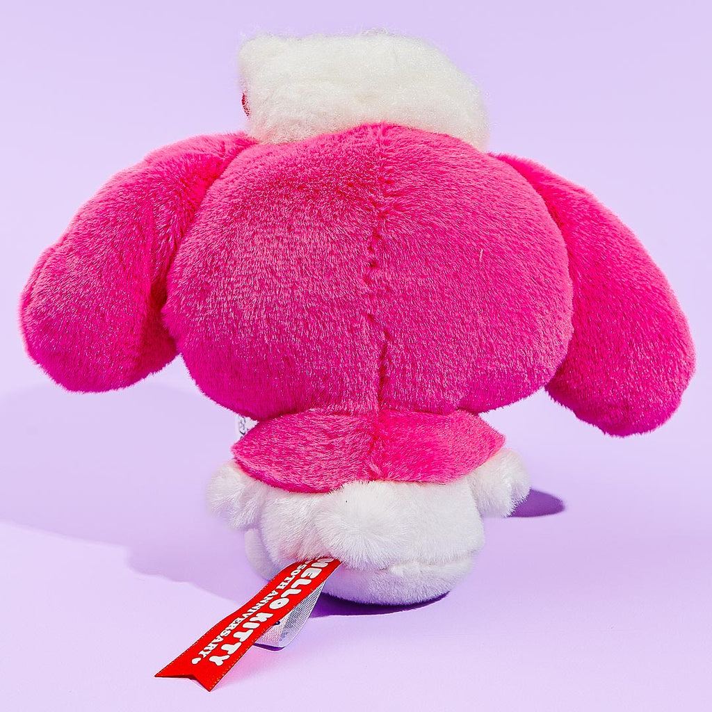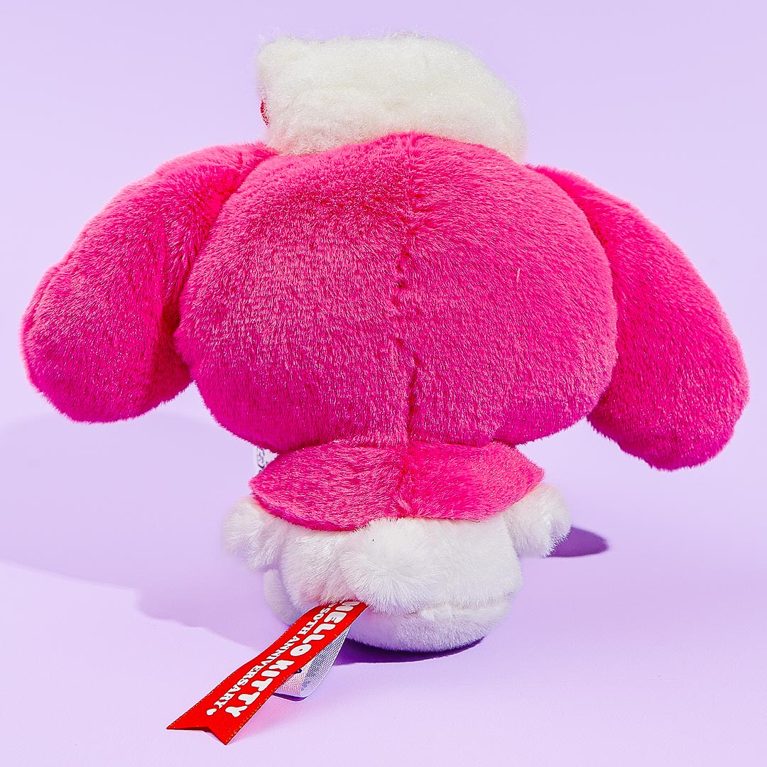 My Melody is ready to join the fun celebration of Hello Kitty's 50th anniversary! This medium-sized plushie is wearing a Hello Kitty headgear and has a vibrant pink color. You can place it on your shelf as a kawaii display or attach it to your backpack using the removable ball chain.