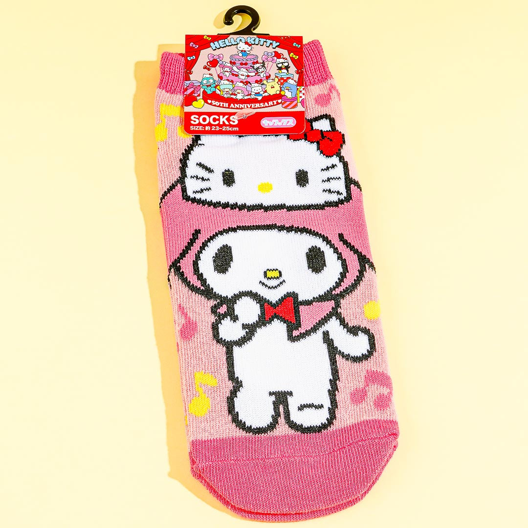 These socks feature a cute print of My Melody wearing a Hello Kitty headgear! The design is part of the special celebration of Hello Kitty's 50th anniversary. Make your feet look cute and comfy by wearing these kawaii socks!