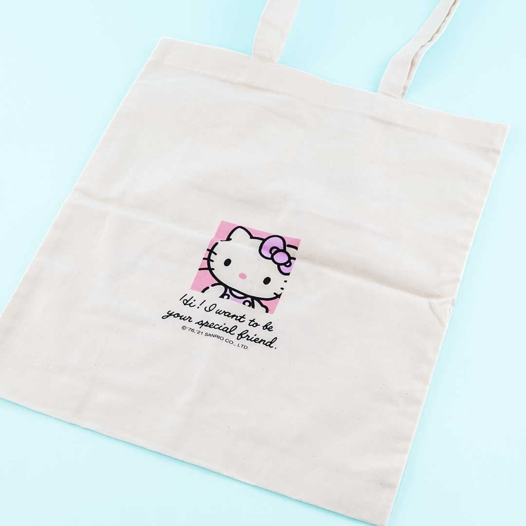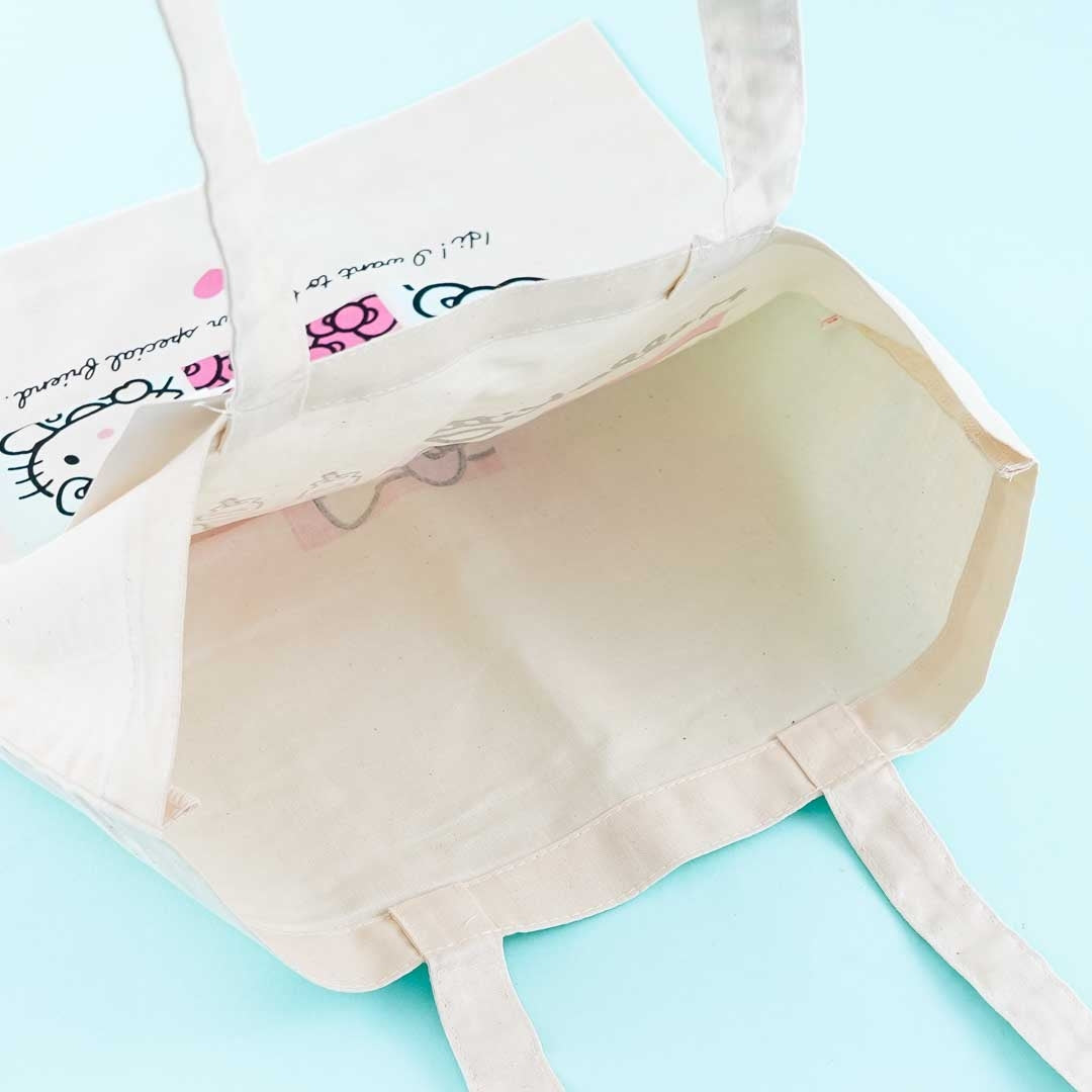 • A kawaii tote bag from the Sanrio Characters cotton tote bag series featuring prints of Hello Kitty, milk, and ribbons