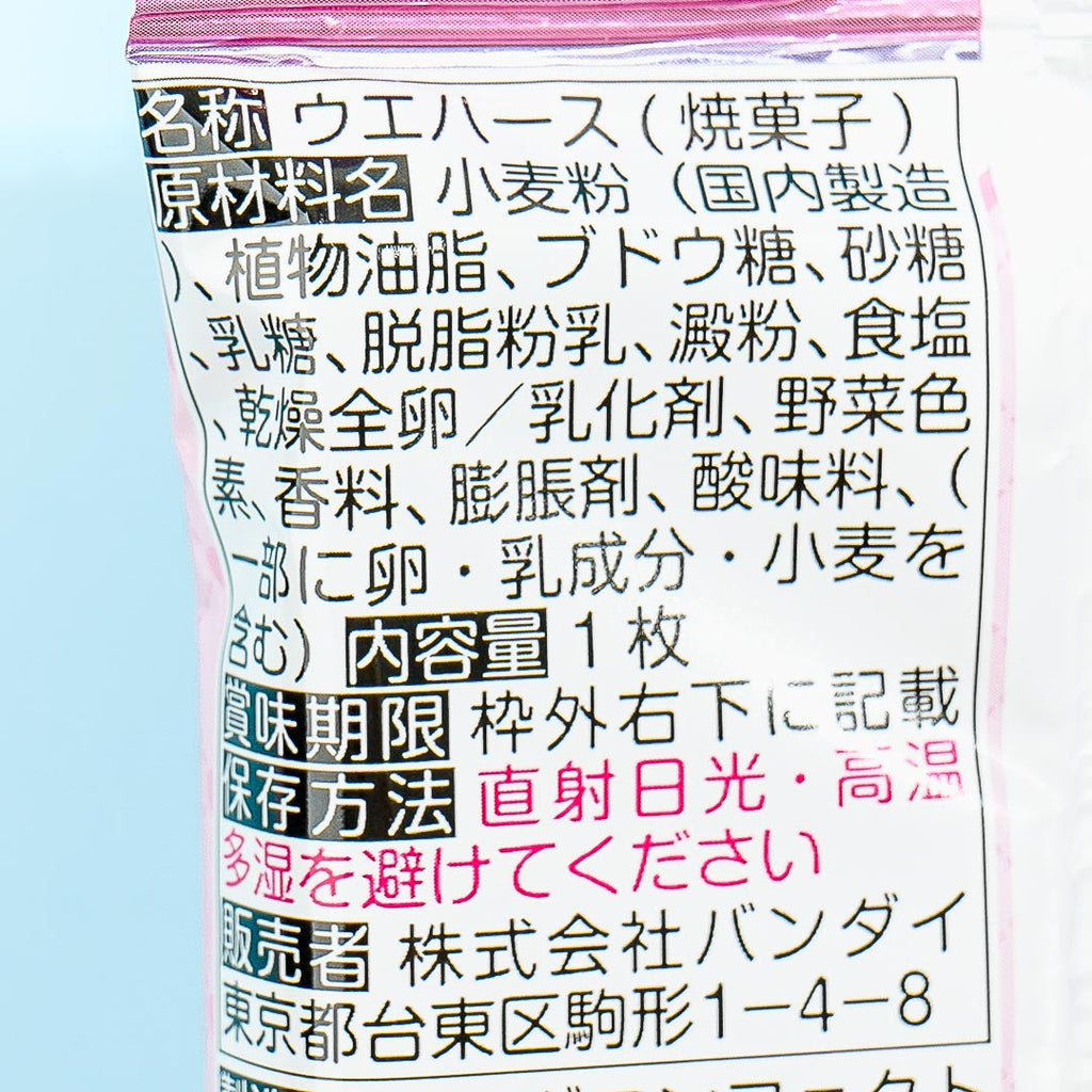 Includes: 1 x strawberry cream wafer snack and 1 x free double-sided metallic card