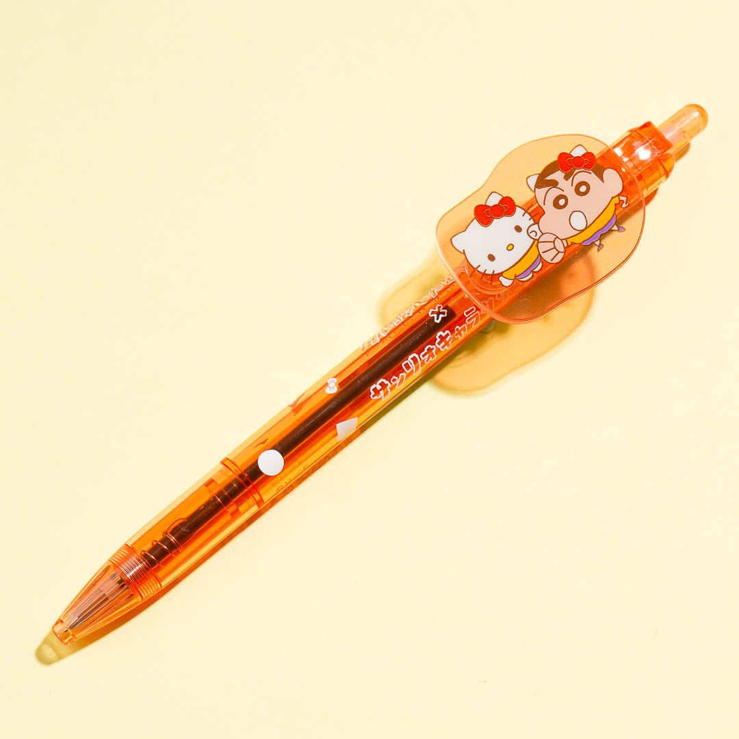 Have fun writing with this kawaii transparent pen! It comes from a collaboration between Sanrio and Crayon Shin-Chan. This pen has an acrylic clip illustrated with Hello Kitty and Shin-Chan punching the air!