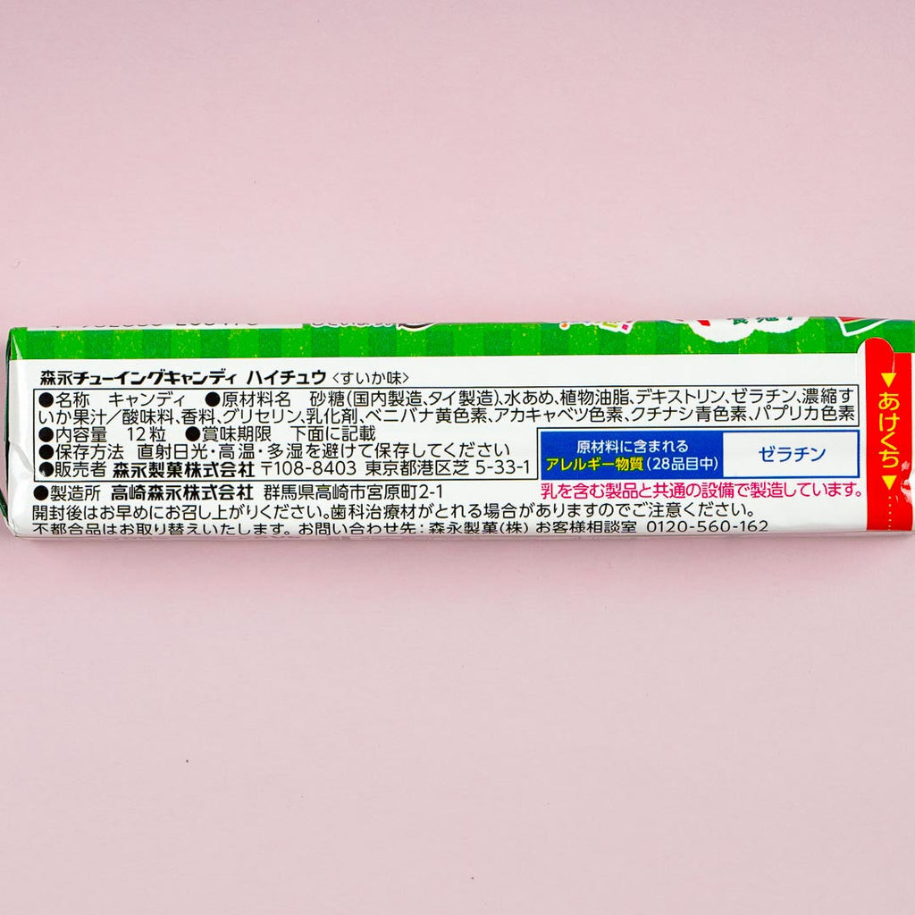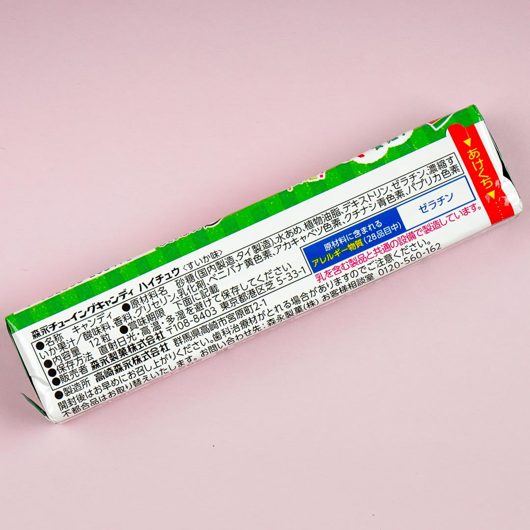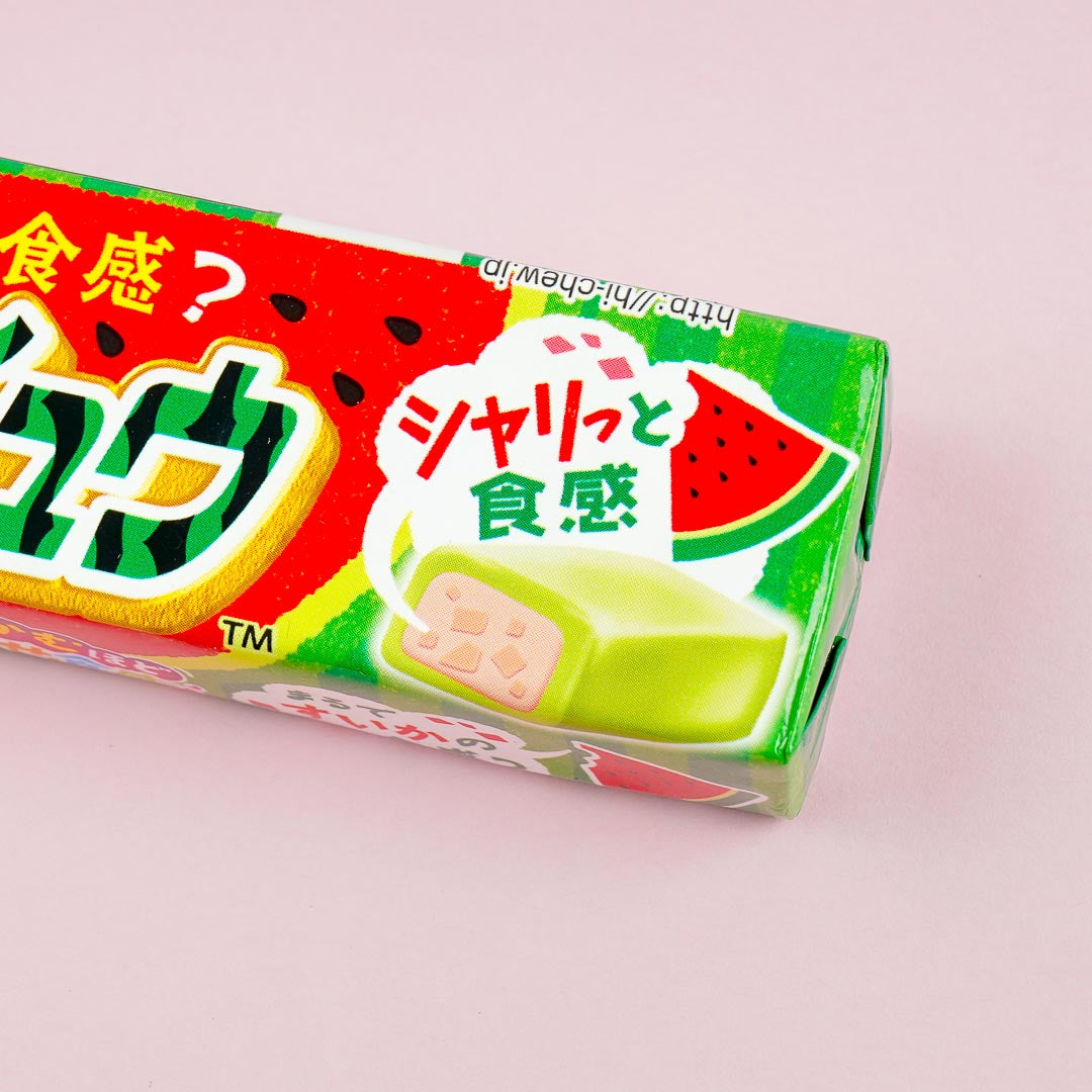 Enjoy the refreshing look and taste of this Hi-chew candy! It has a green outer layer and a red center filled with a crunchy texture to resemble a watermelon.