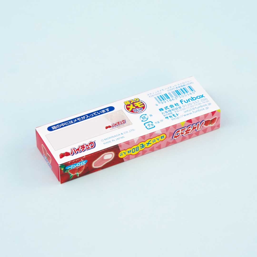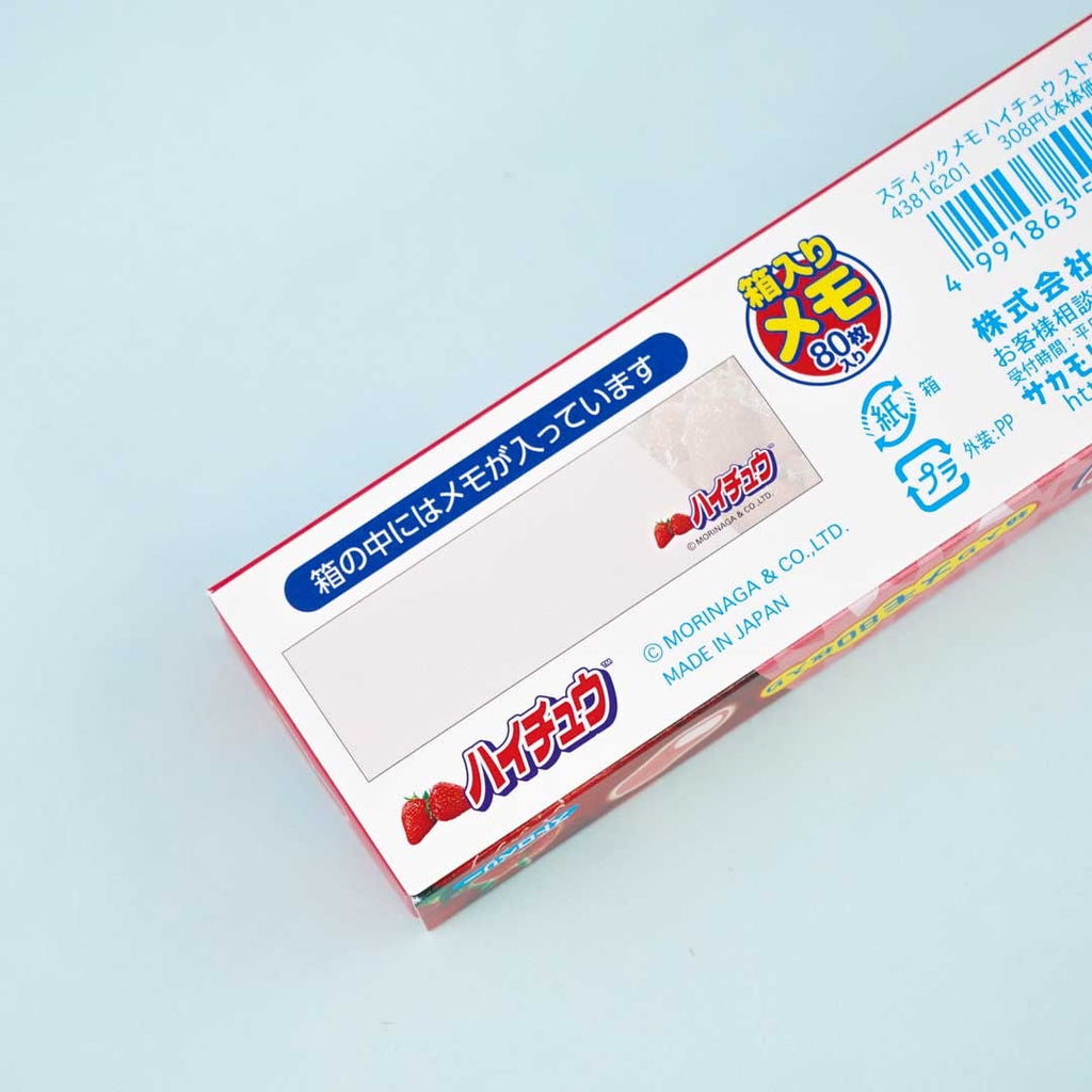 A super cute sticky notes with a box that is shaped like the Hi-Chew Strawberry candy stick pack