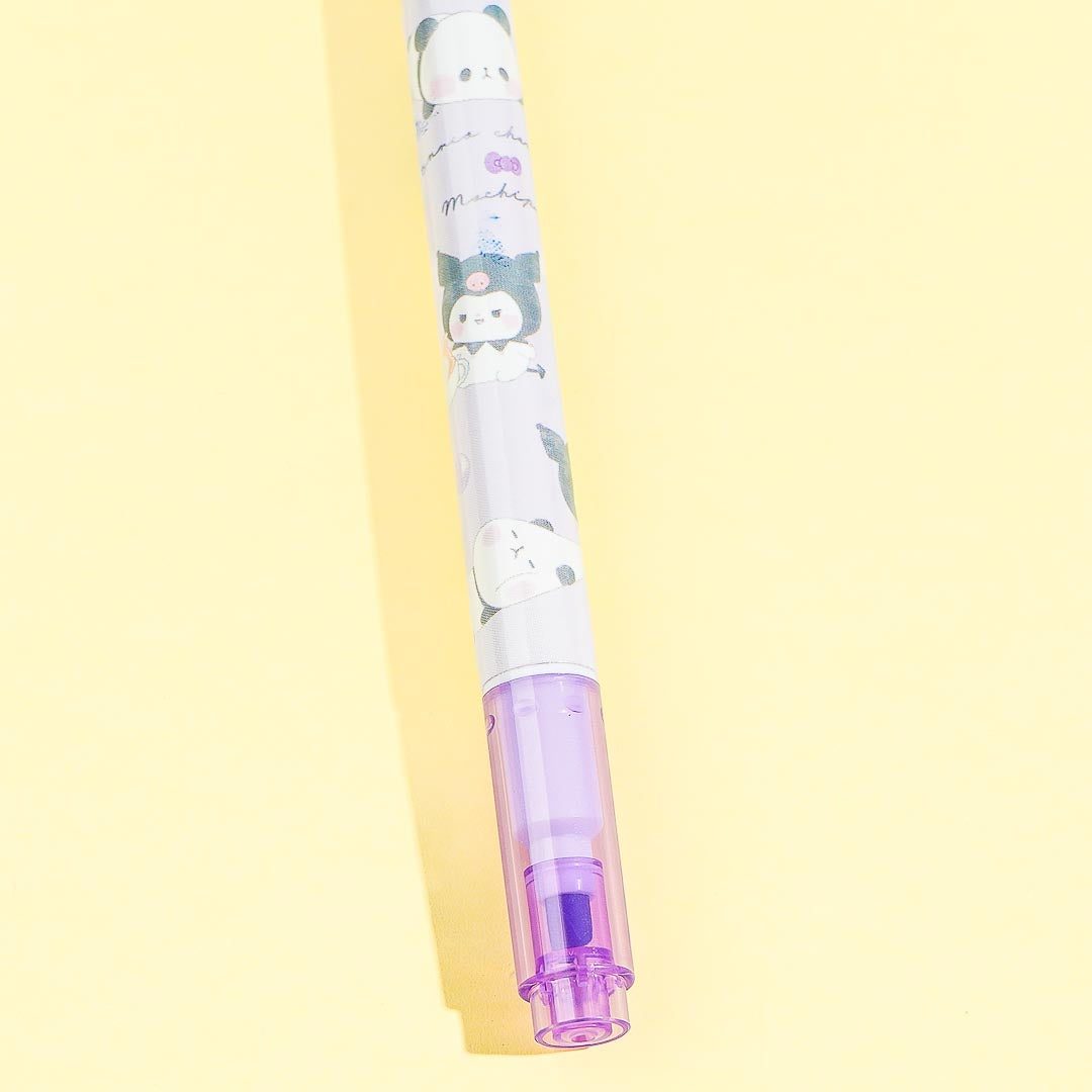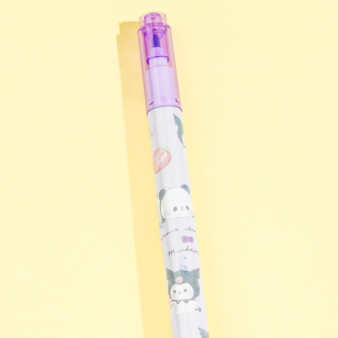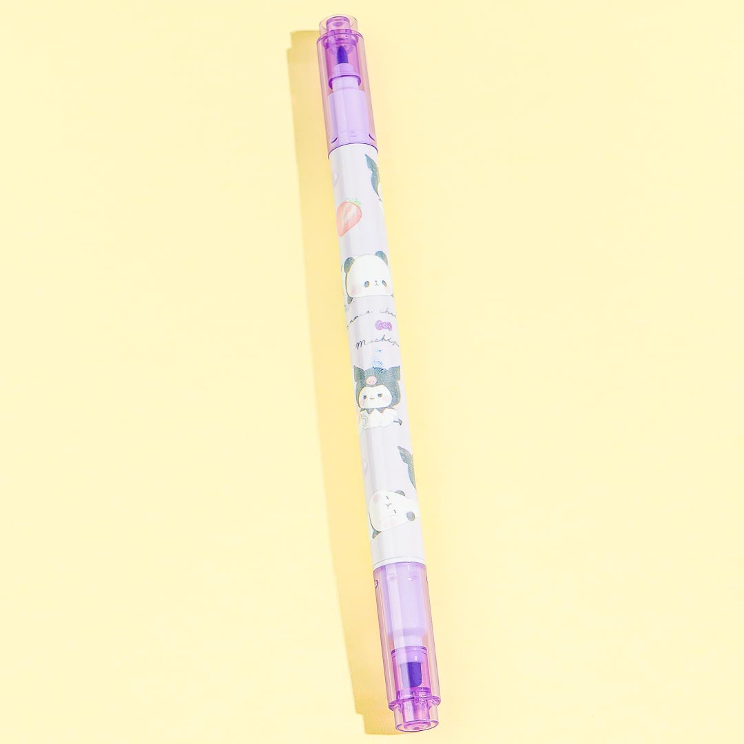Use this super cute twin marker to scribble on your scrapbook. It's illustrated with Mochi Mochi Panda playing around with Kuromi! This twin marker has a medium tip and flat tip for you to use.
