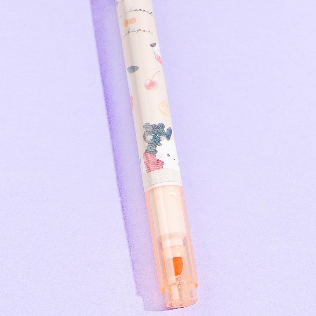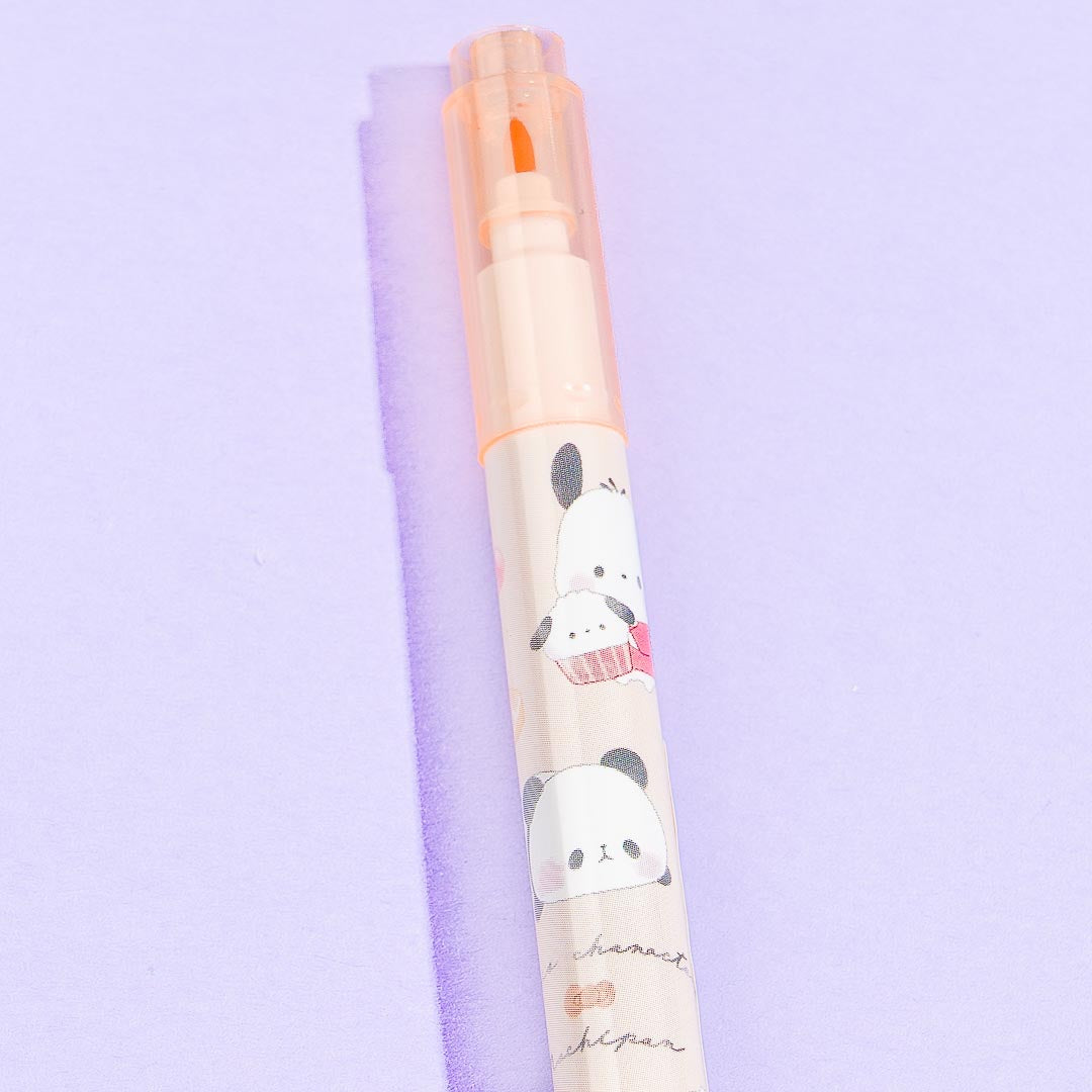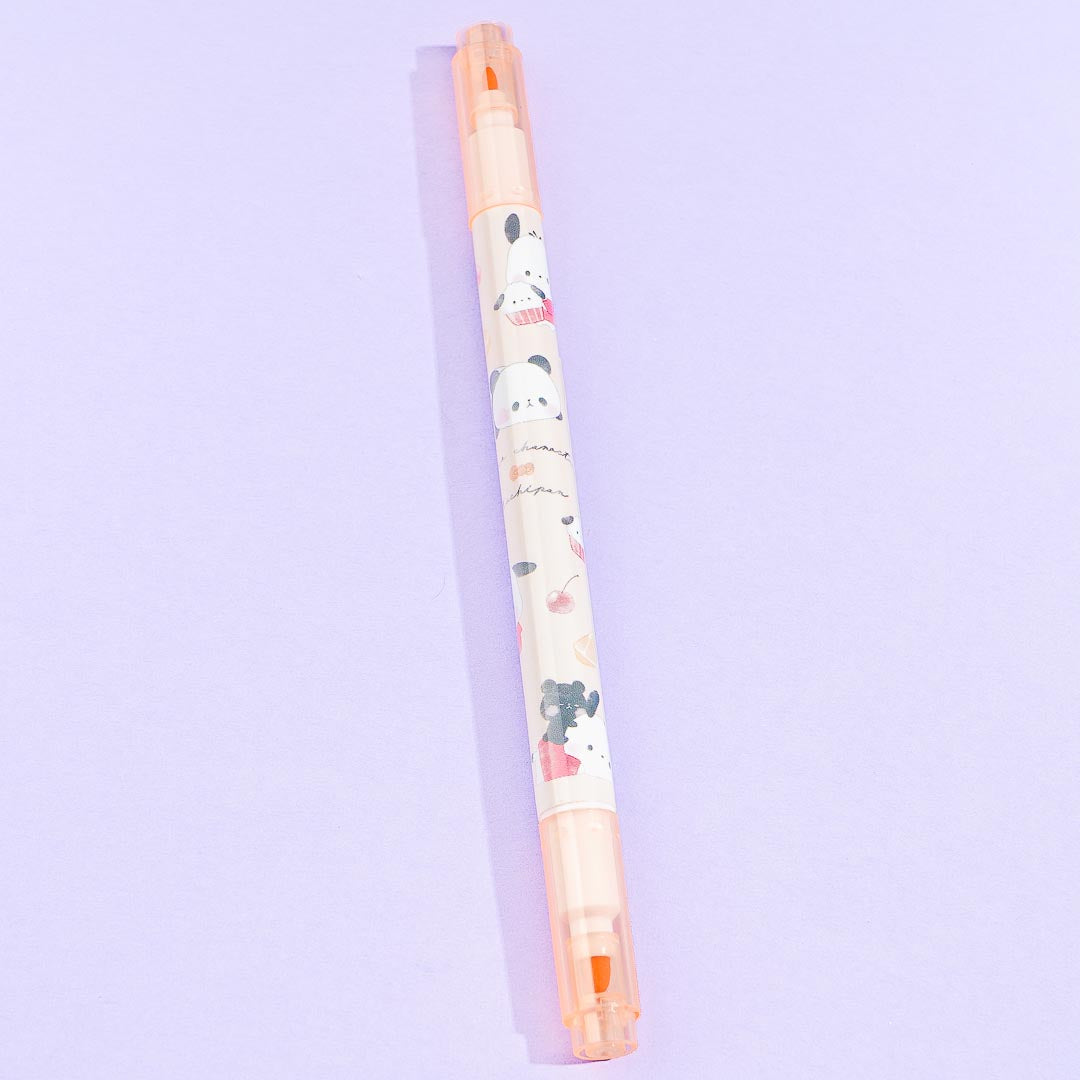 Use this twin marker to write nice big text in your scrapbook! It's illustrated with Pochacco and Mochi Mochi Panda hanging out with each other. This marker has a medium tip and a flat tip that you can use to write with.