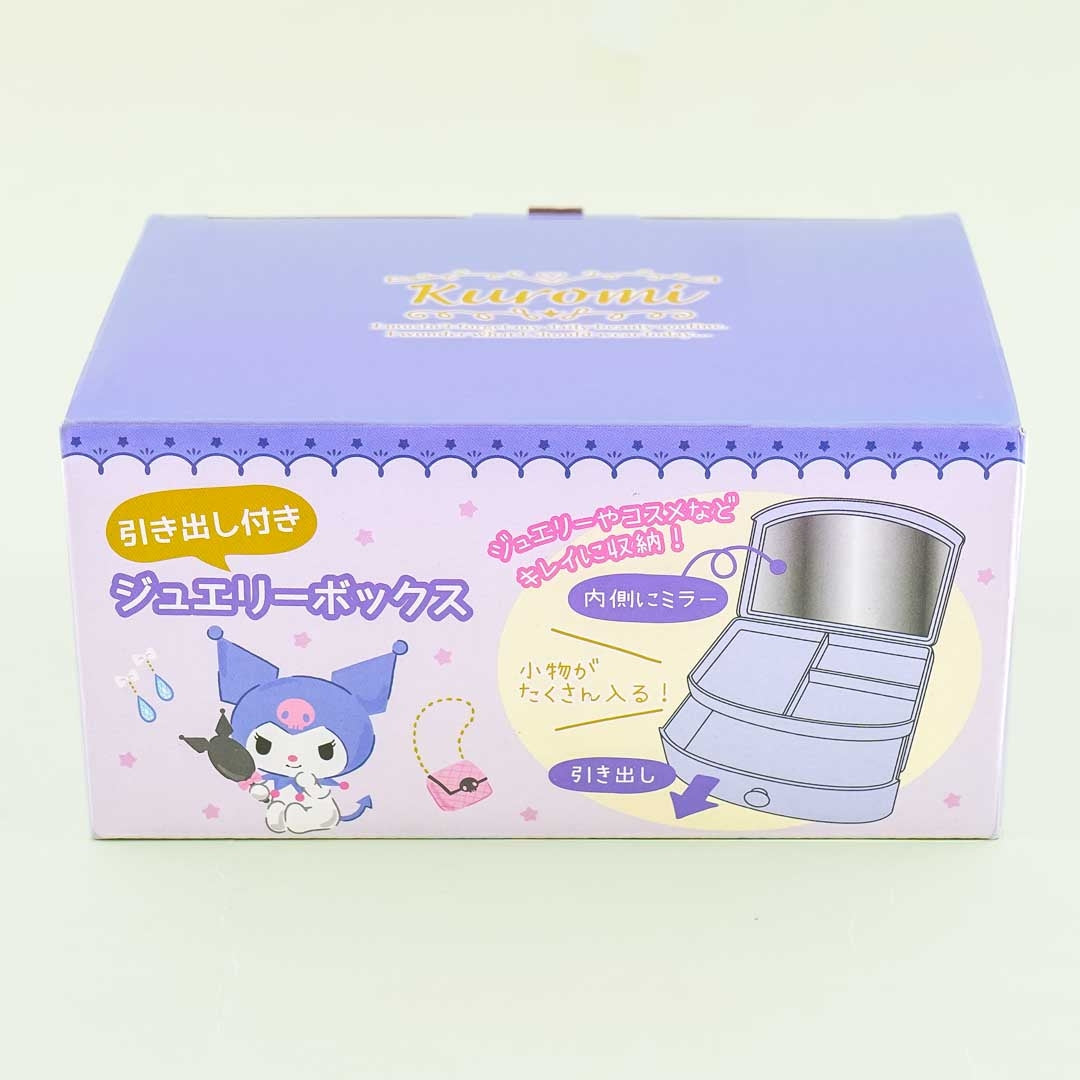 This kawaii jewelry box is covered in prints of Kuromi with a mirror, a purse, a ribbon, and other beauty items! It has a drawer, a top compartment with partitions, and a mirror. Use it to store your jewelry and trinkets!