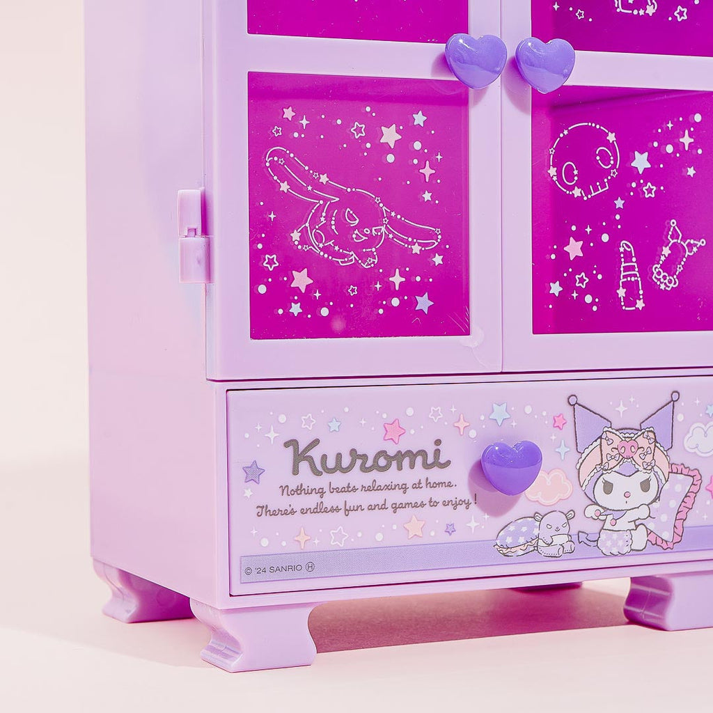 Keep your favorite bracelets and rings inside this super cute accessories case! It looks like a miniature version of Kuromi’s bedroom closet. It has double doors, two shelves, and a single pull-out drawer. The transparent windows of the case are also decorated with prints of Kuromi, constellations, and makeup products!