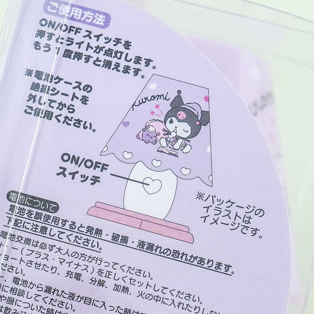 Have the sweetest of dreams as you turn on this super cute night light! This resin lamp features a print of Kuromi with Baku and is made of sturdy resin. It comes with a built-in LED light, a heart-shaped switch, and a base that looks like a star. The kawaii mini room light is battery-operated!