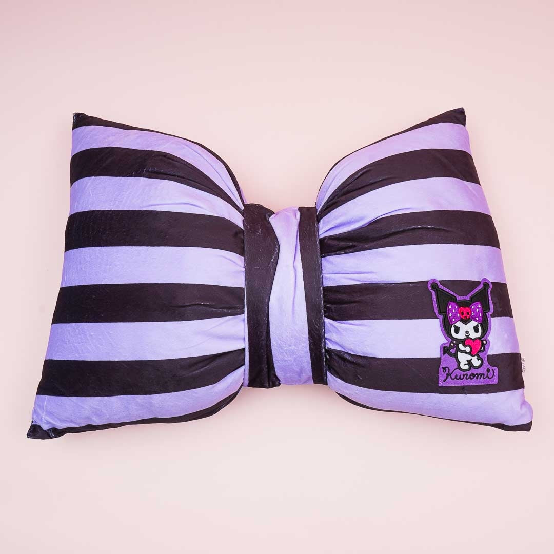 A cute ribbon-shaped cushion with stripes and a small illustration of Kuromi