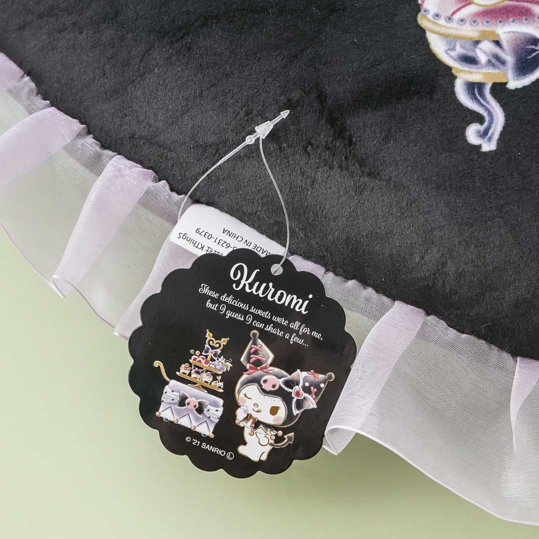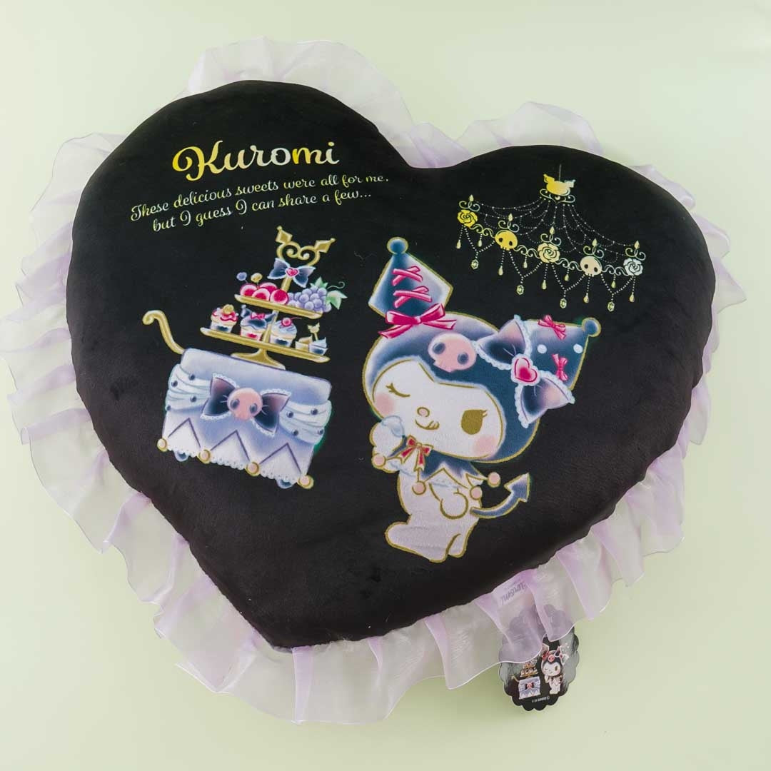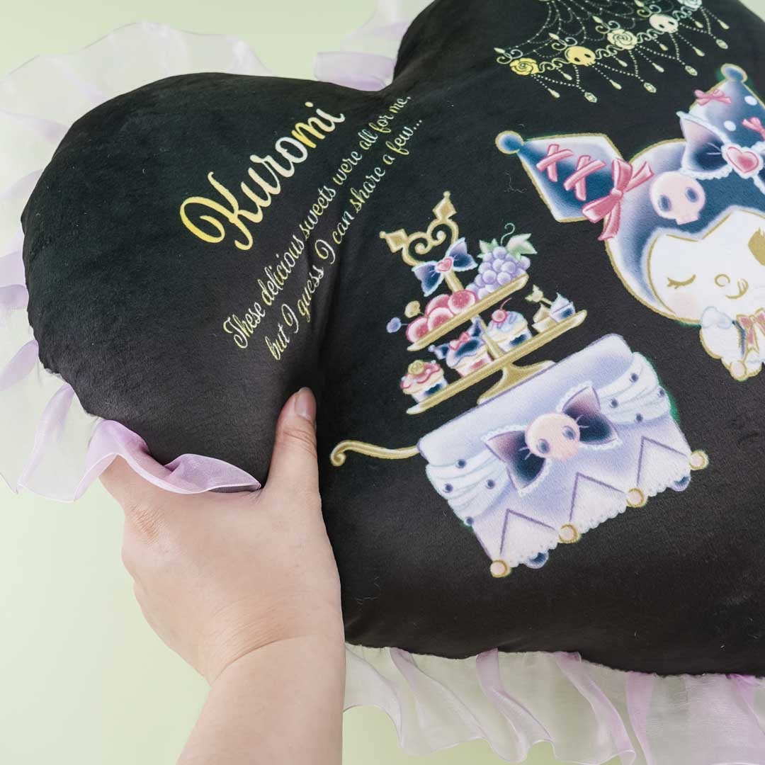 This cute and comfortable lacy heart-shaped cushion is the perfect decor for your sofa! It features prints of Kuromi eating sweets.