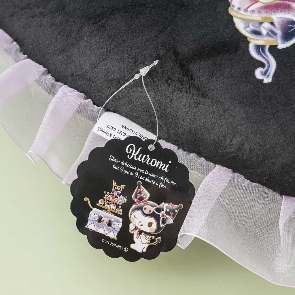 • A kawaii lacy heart-shaped cushion showcasing prints of Kuromi eating sweets
