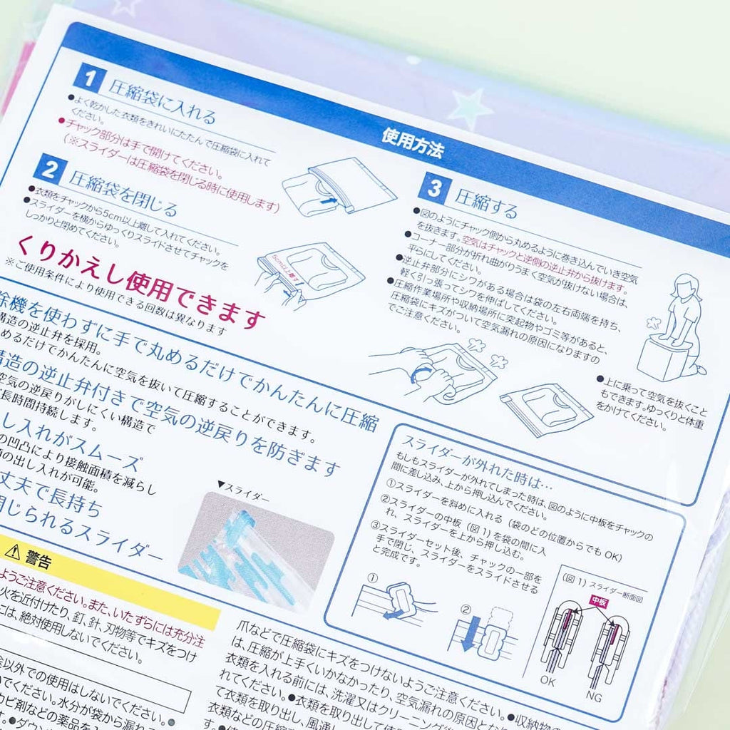 Store clothes for travel inside these super kawaii compression plastic bags covered in prints of the Little Twin Stars! They have slider closures to keep your items safe. You can store two to three shirts inside each bag. Just place the shirts inside, then squeeze the air out.