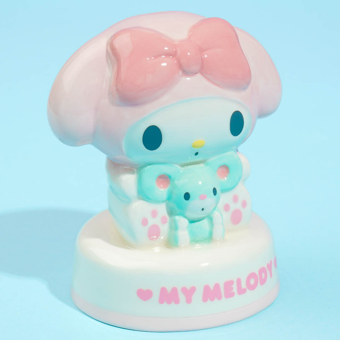Save your loose change and extra money inside this super cute coin bank! It features a standing My Melody hugging Flat, her blue mouse friend. You can also use this to kawaii-fy your desk!