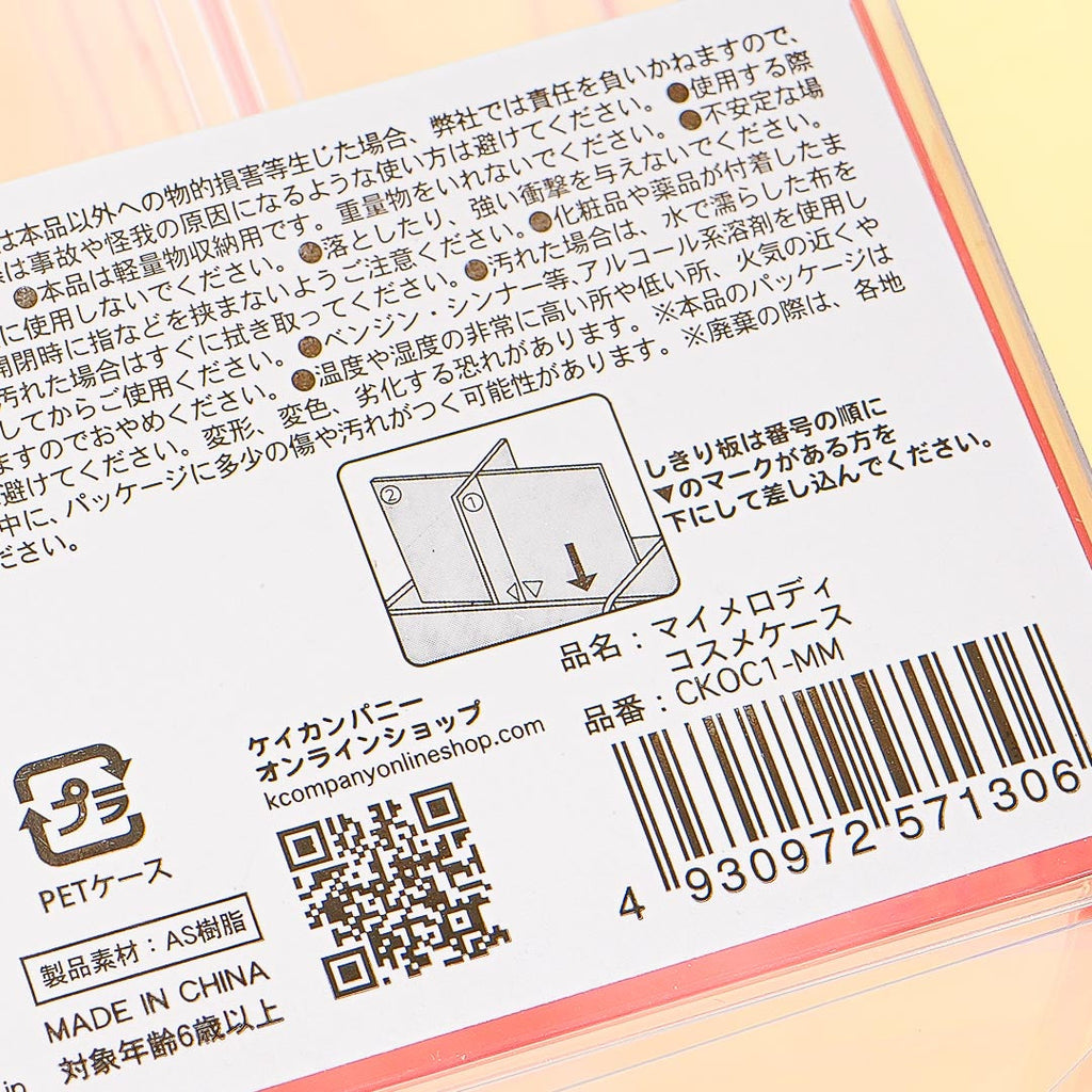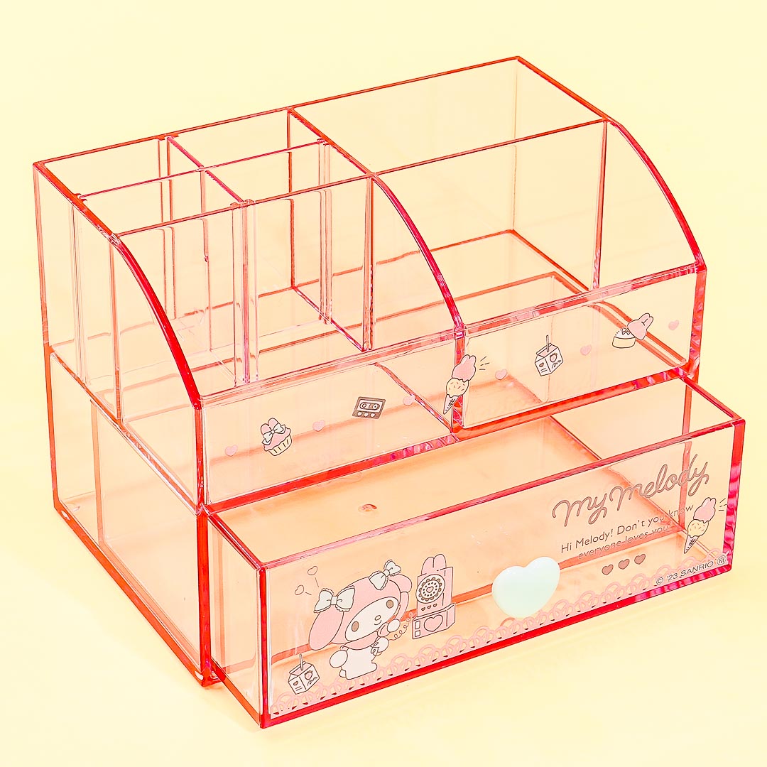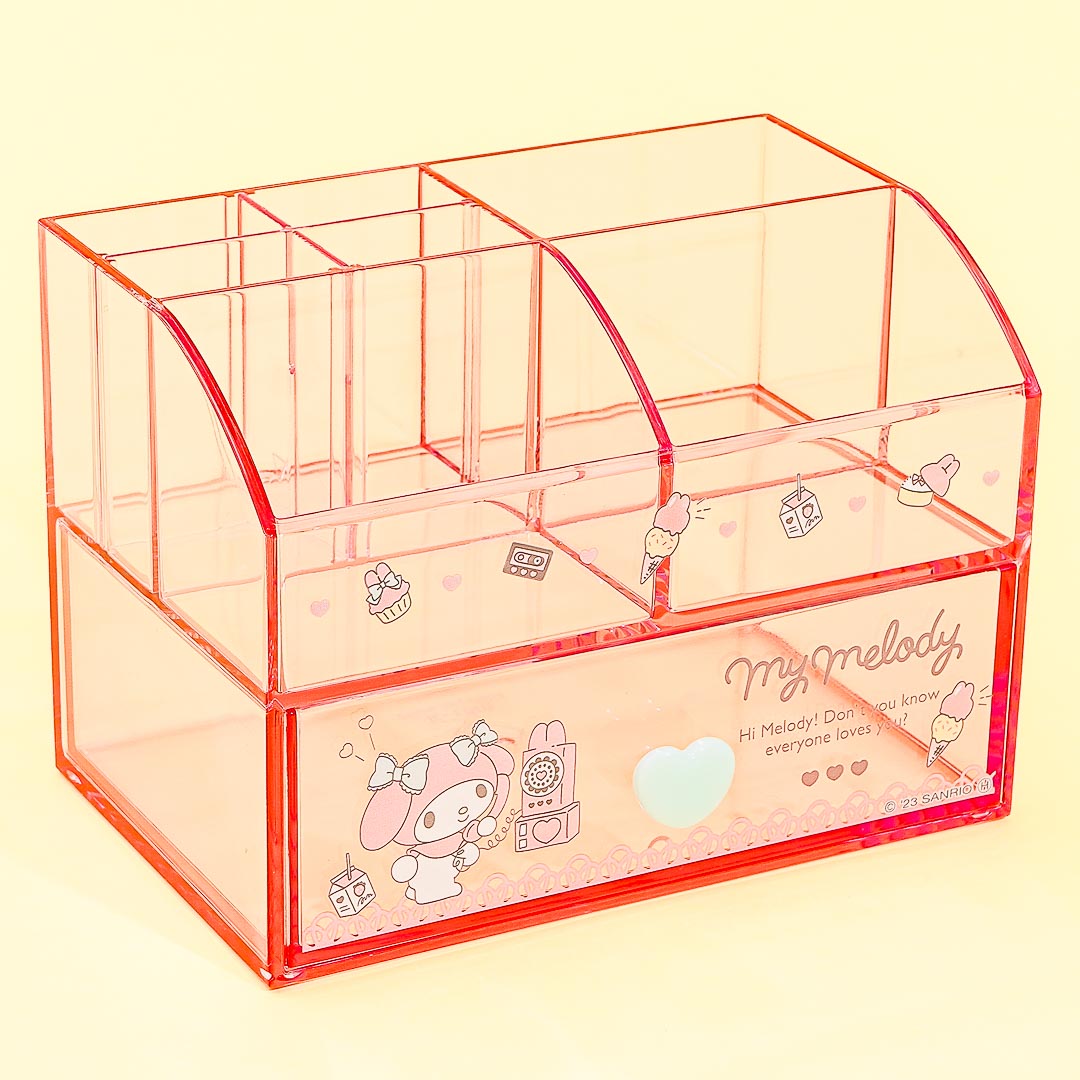 Use this cute transaprent cosmetic organizer to keep all of your brushes, lipstick, and other makeup items. It's decorated with a print of My Melody making a phone call while being surrounded by cute things! This organizer has multiple compartments, a heart-shaped drawer handle, and a detachable divider. You can also use it as a desk organizer!