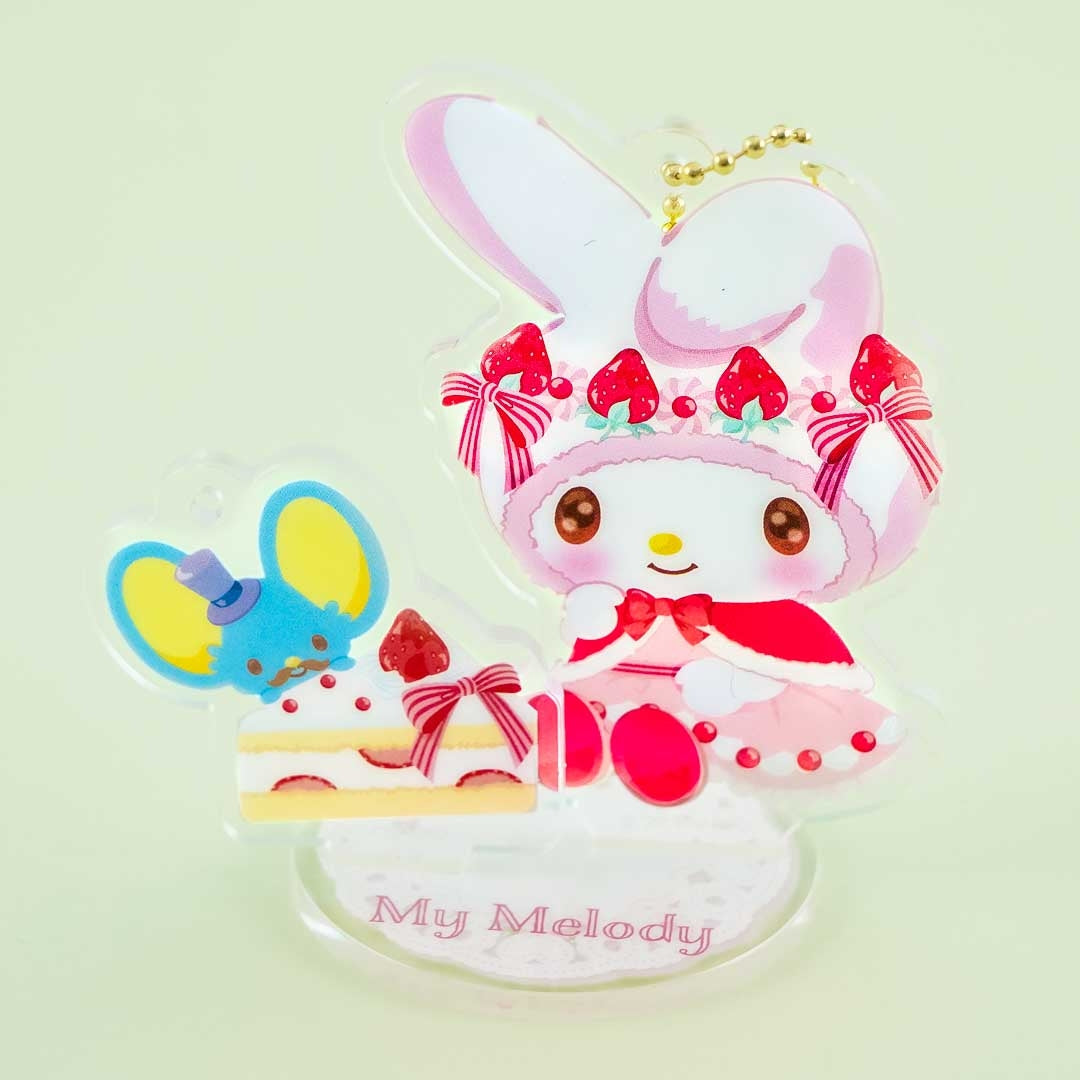 This kawaii acrylic stand set features My Melody and a mouse friend with a strawberry shortcake! Use it to decorate your desk. It comes with a removable ball chain so you can keep all parts together. You need to assemble this stand set together before placing it on your desk.