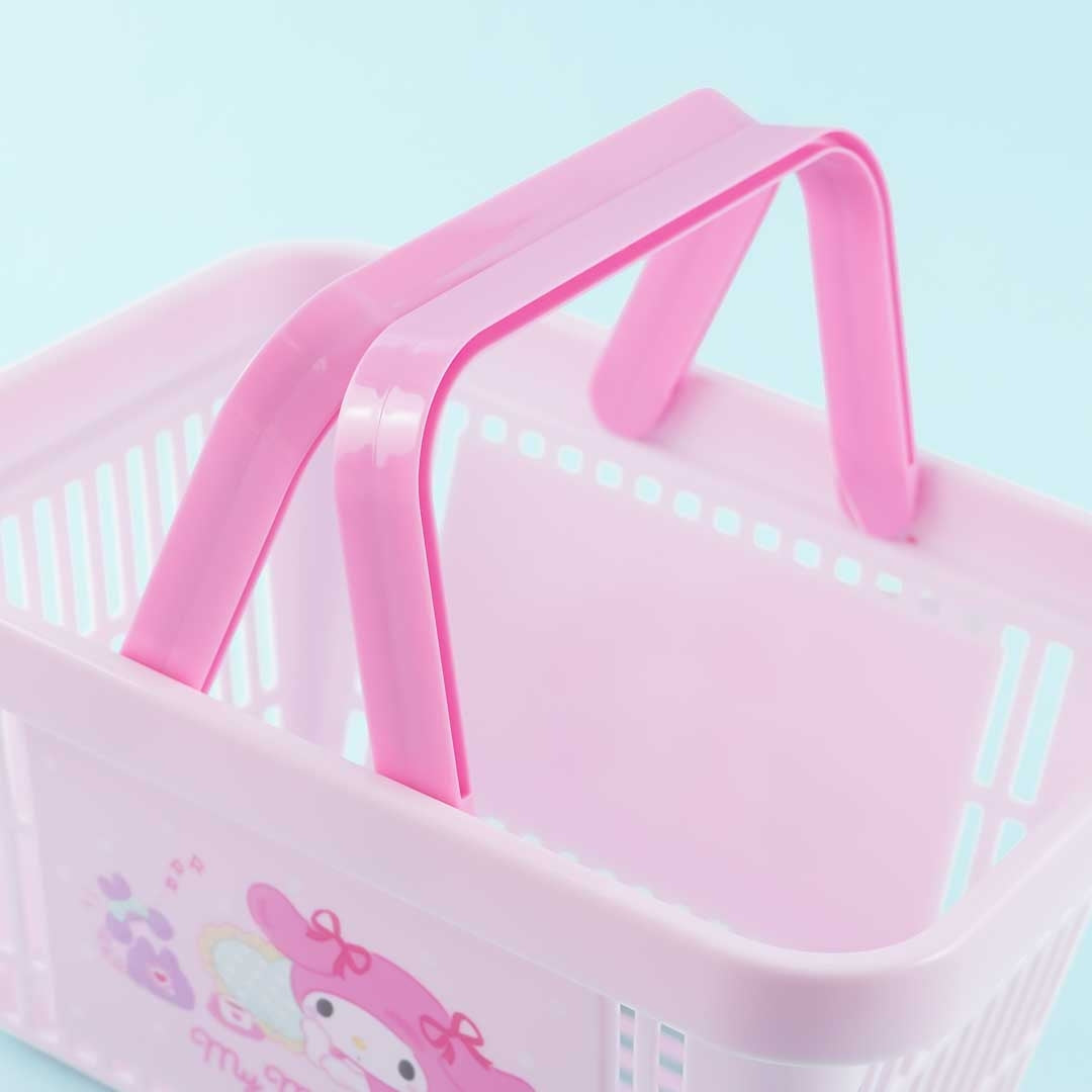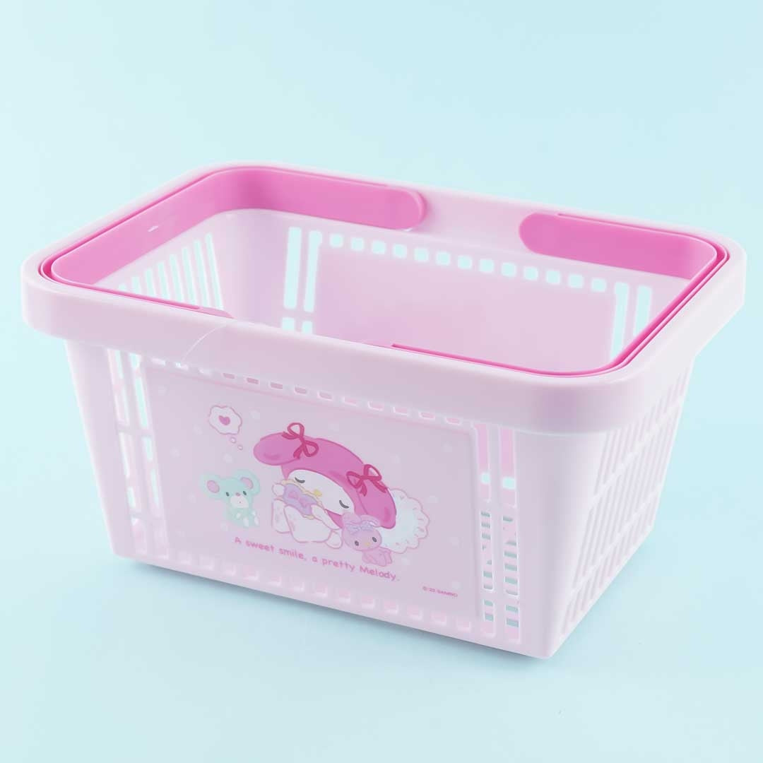 A mini shopping basket featuring prints of a sleeping My Melody, phone, and plushies