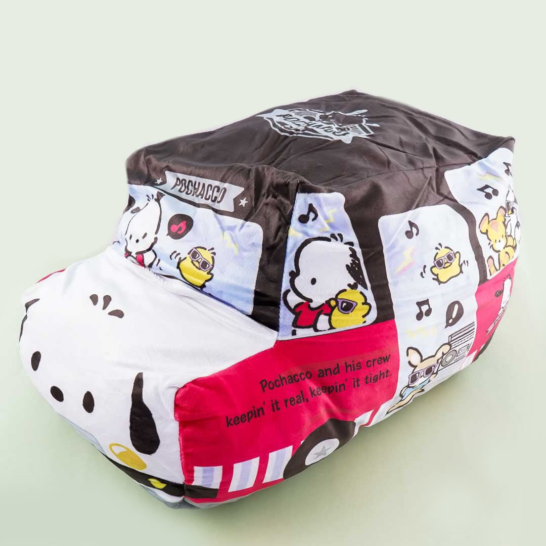 A super cute van-shaped cushion with prints of Pochacco and his friends going on a road trip